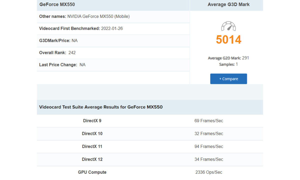 Esto implica que estas nuevas gráficas de NVIDIA apenas ofrecen un 0,9 % más de velocidad, lo que, con tan sólo una única muestra por el momento, se encuentra dentro del margen de error. De hecho, cabe destacar que PassMark no suele ser un puntos de referencia especialmente popular dentro de la valoración de GPUs actualmente, debido principalmente a que cuentan con una cantidad muy limitada de muestras disponibles, en este caso, apenas comparando una única muestra de las GeForce MX550 con nueve muestras con 5900HS iGPU.