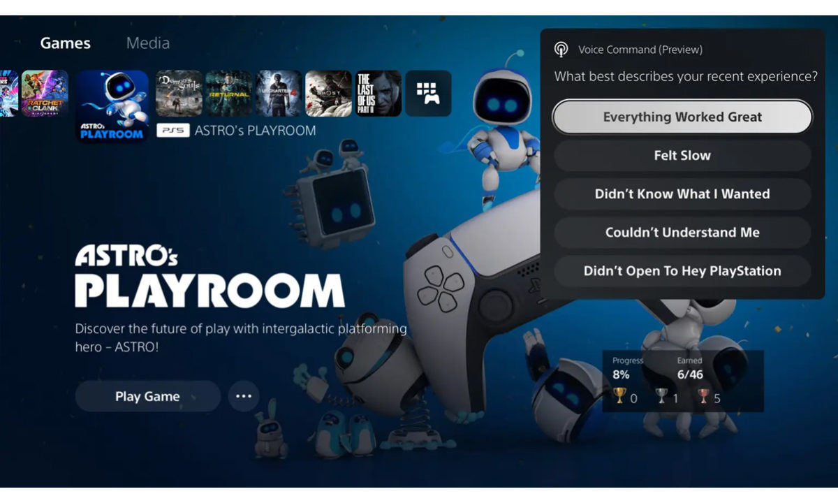 Comenzando con una versión beta sólo disponible inicialmente para los usuarios de habla inglesa en los Estados Unidos y Reino Unido, aunque ya confirmada para una adición posterior en el resto de idiomas, la compañía está agregando una opción de sistema que hará que la consola responda al comando por voz «Hey PlayStation», de manera similar al que actúan actualmente las PS4, permitiéndonos navegar por el menú e incluso lanzar aplicaciones.