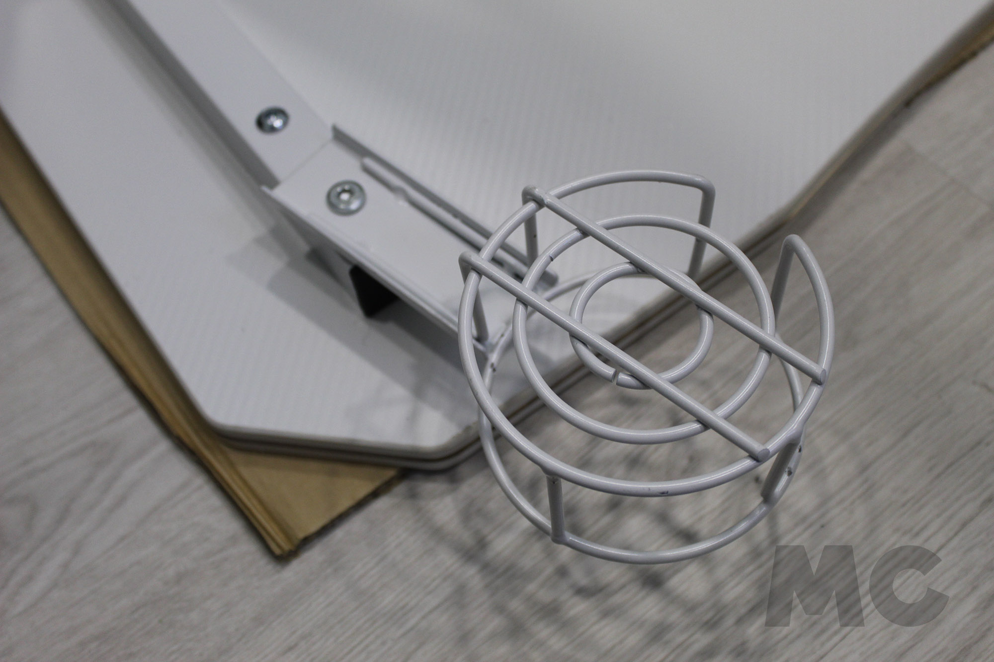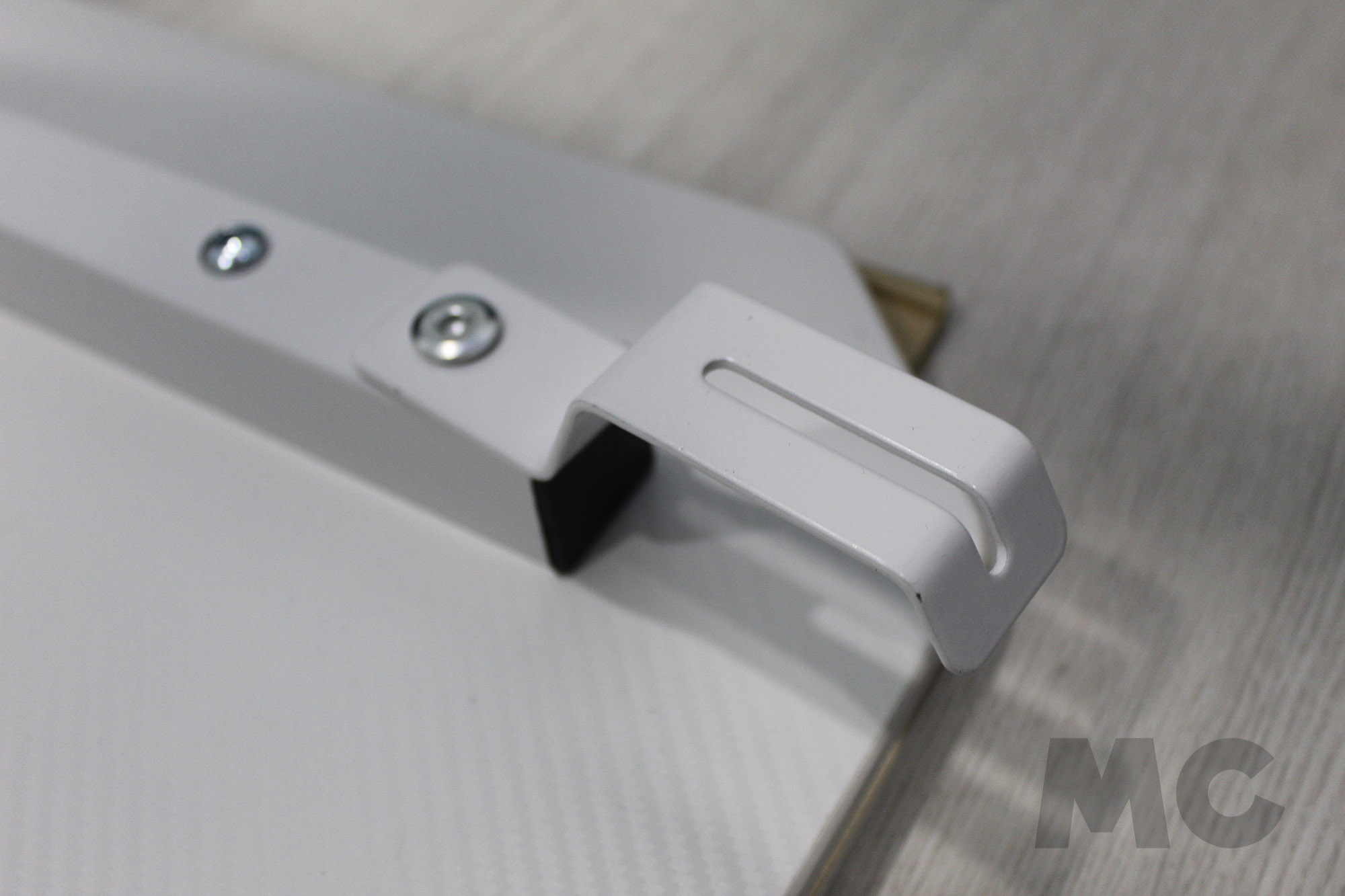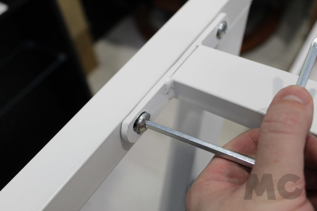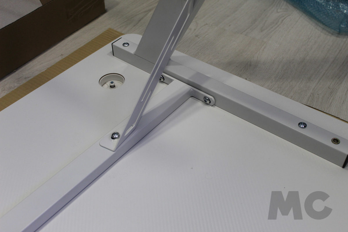 Una vez montado el chasis, tan sólo tendremos que apoyar la estructura sobre el panel del escritorio volteado, de manera que podamos atornillarlo sin tener que cargar el peso sobre la estructura. También antes de colocar la mesa en su posición normal, terminaremos de ajustar el resto de complementos como el posavasos o el gancho para auriculares.