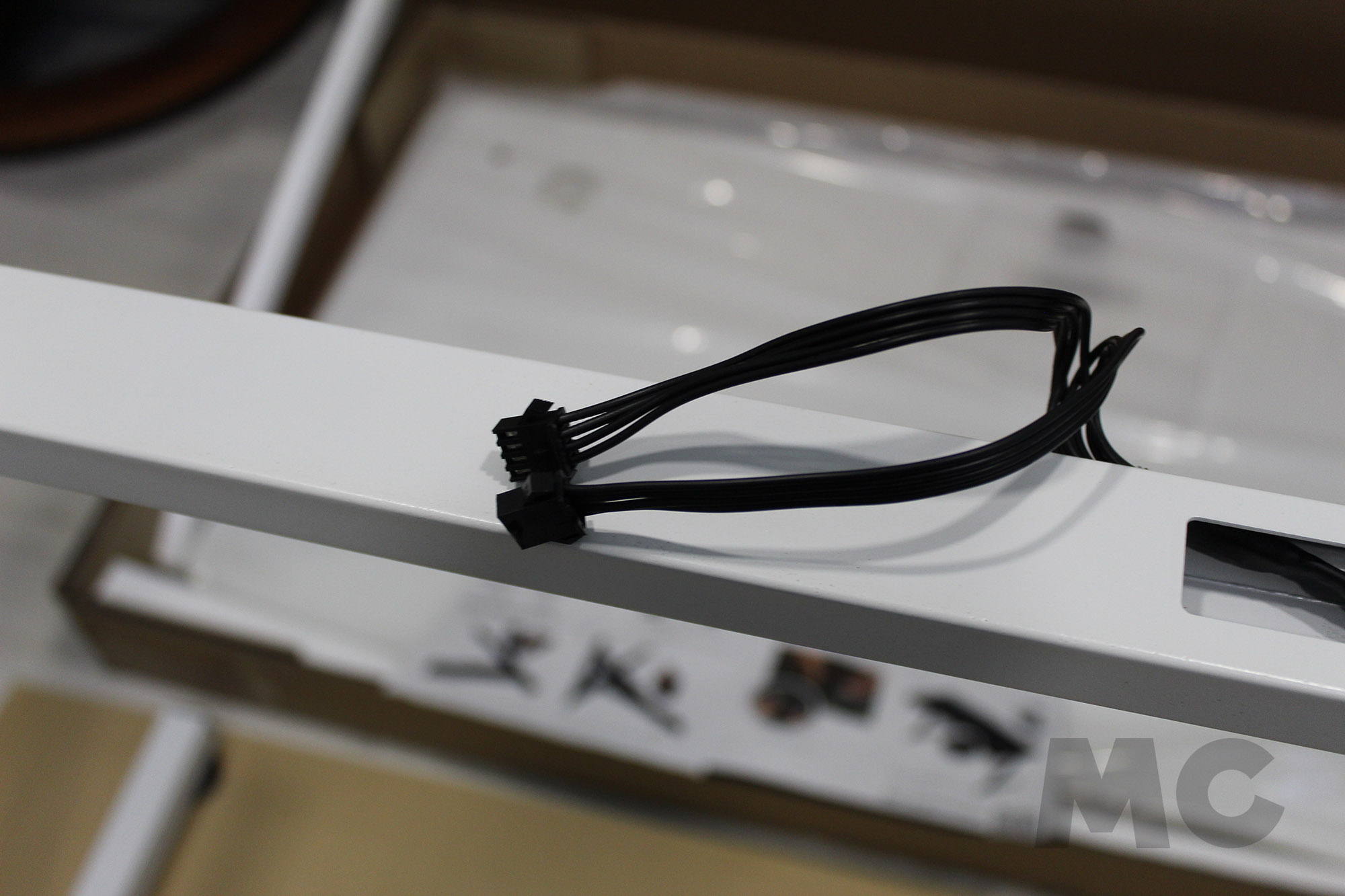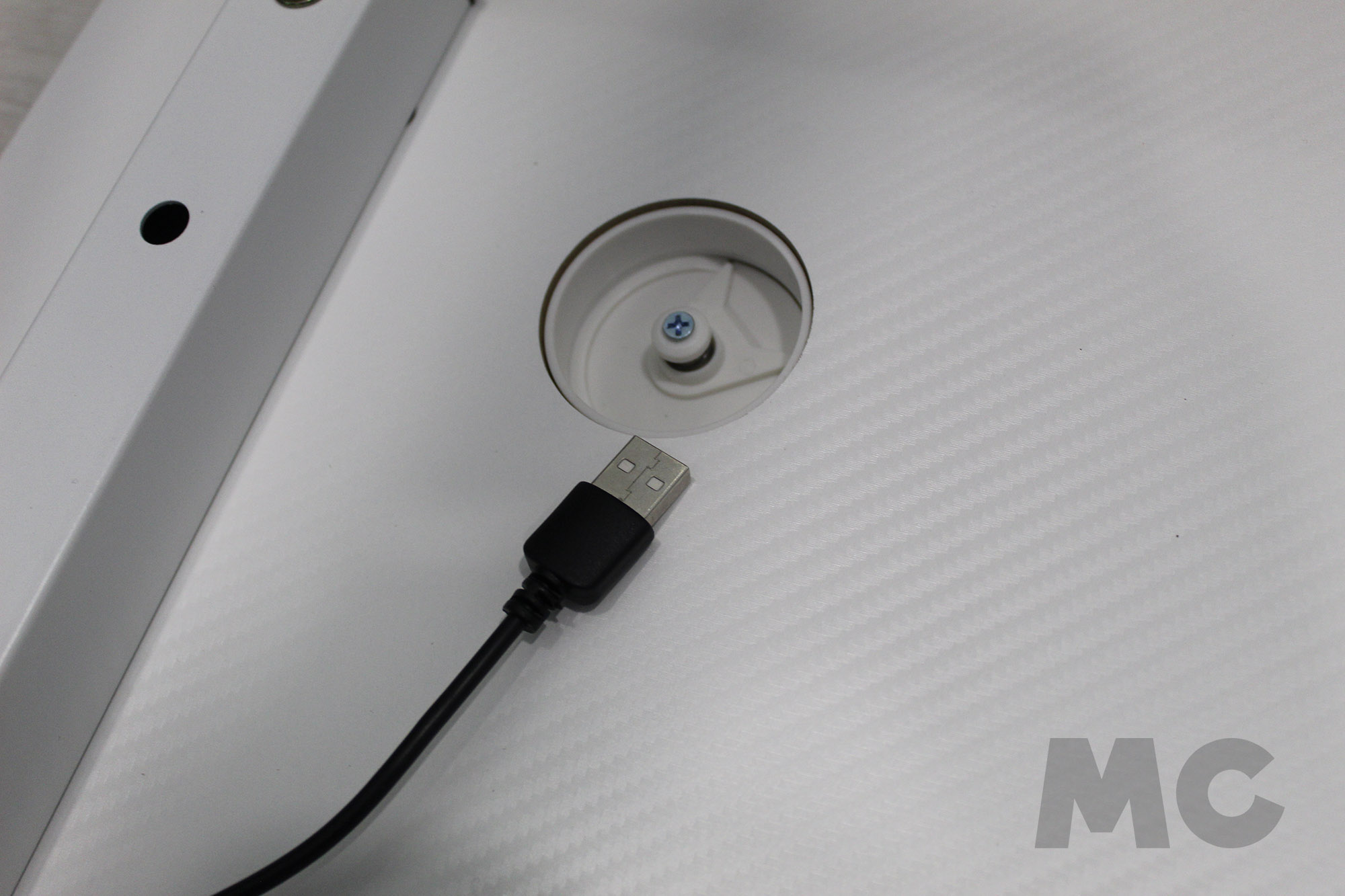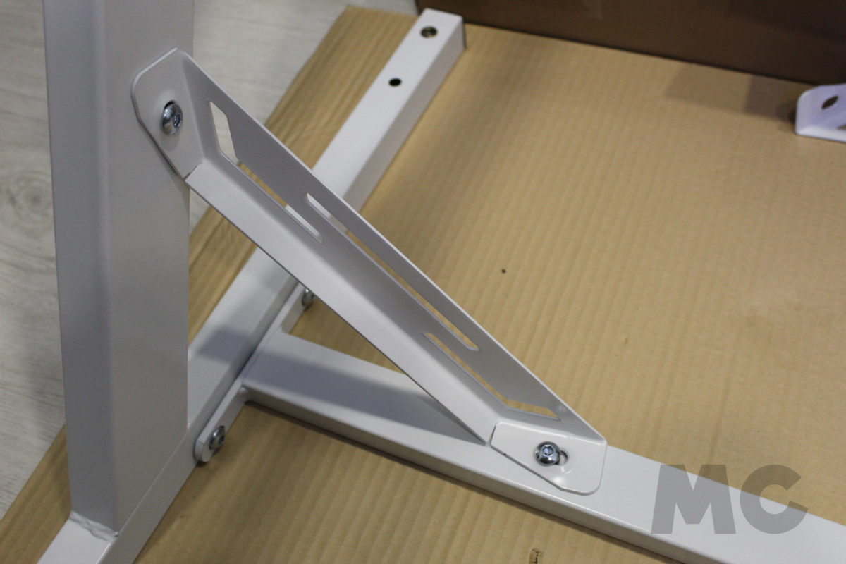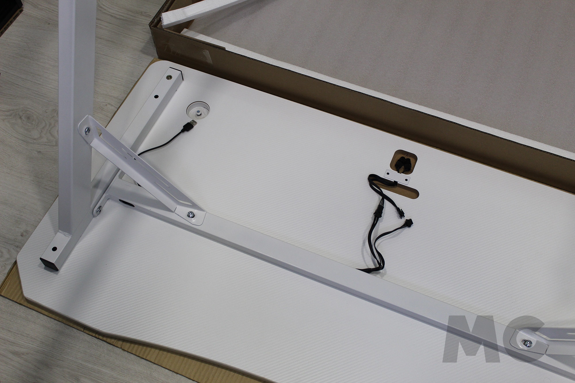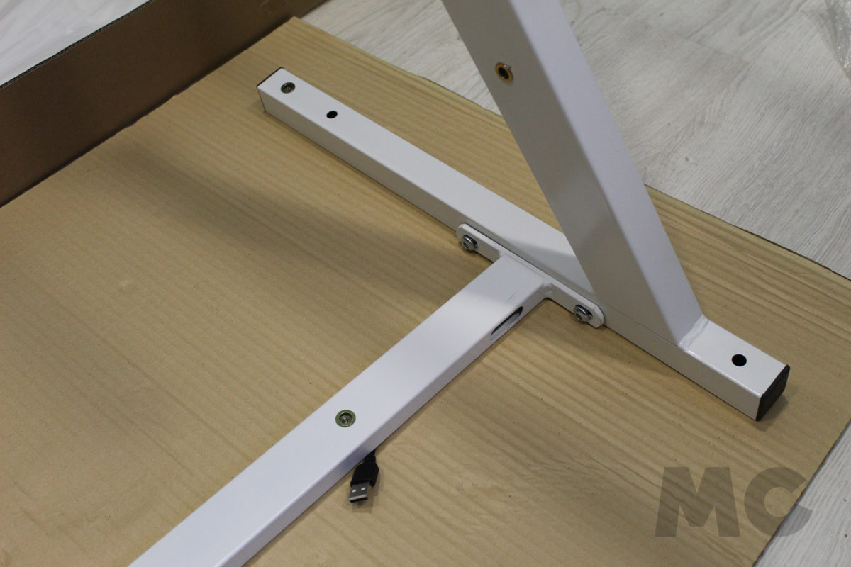 Así pues, el montaje comenzará por la propia estructura de la mesa, montando los protectores para las patas, juntando éstas al chasis central para otorgarle una ligera estabilidad a la misma, y terminando de rematar la estructura con las escuadras incluídas. Algo que podremos hacer volteando las patas para utilizar el suelo (o mesa de trabajo) como punto de apoyo. Como consejo personal, os recomiendo que os fijéis bien en la orientación de esta barra central, y que dejéis ya presentados los cables USB de alimentación para la iluminación RGB que salen de ella.