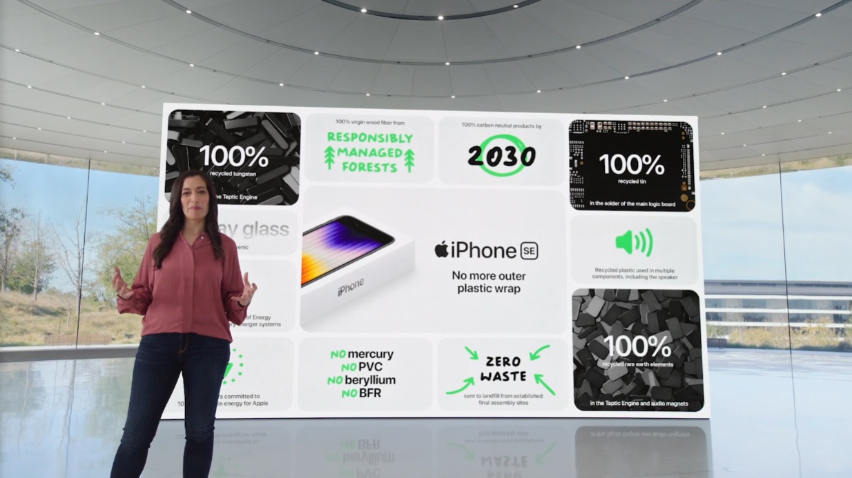 Como cabía esperar, ha repetido su apuesta por utilizar materiales reciclados, y lo ha hecho a lo grande. El iPhone SE 5G es otro paso adelante por parte de la compañía de la manzana de cara a seguir reduciendo el impacto medioambiental de sus productos, como podemos ver en la imagen que encontraréis justo encima de estas líneas.