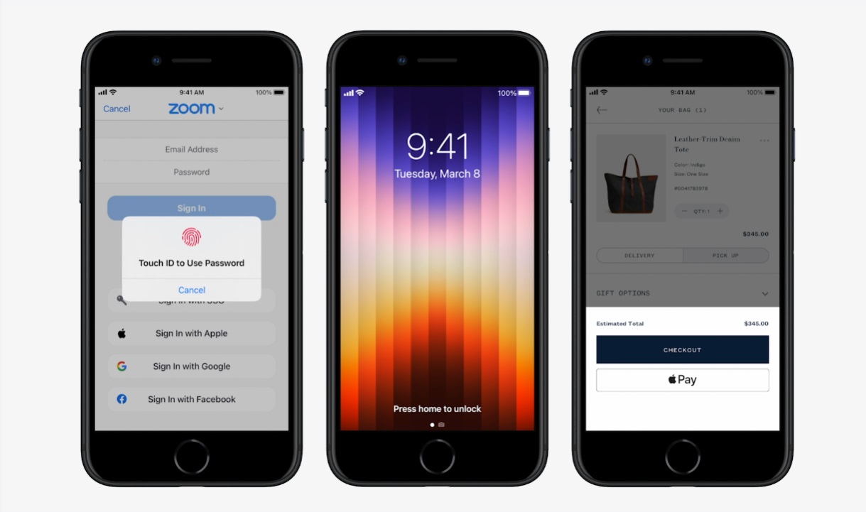 En términos de diseño, el iPhone mantiene la misma línea que hemos visto en el iPhone SE 2020. Este era, a su vez, una revisión menor del iPhone 8, lo que implica que el iPhone SE 5G tiene una pantalla de 4,7 pulgadas, unos bordes de pantalla muy marcados, y cuenta con Touch ID integrado en el botón de inicio como sistema de autenticación.