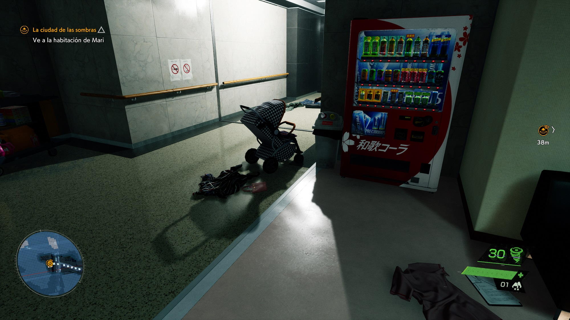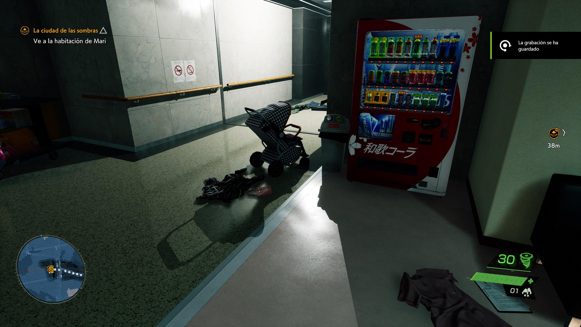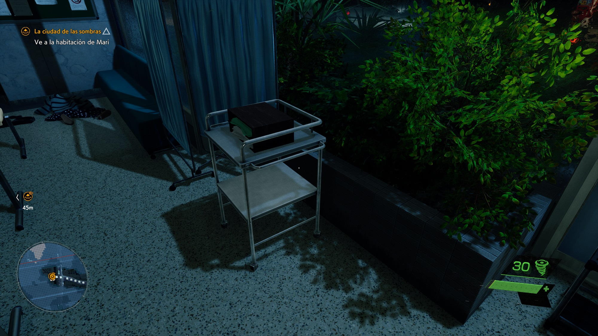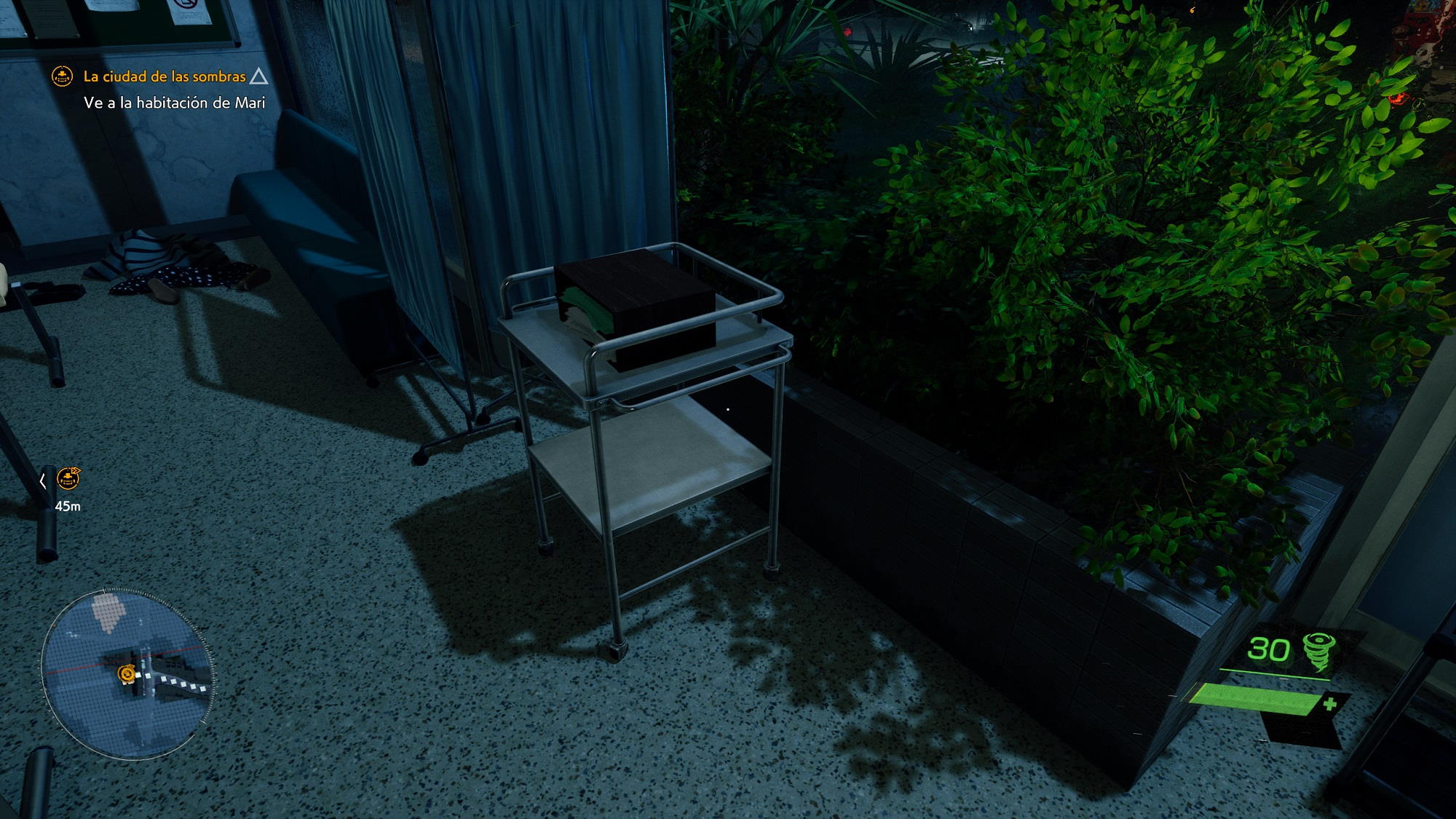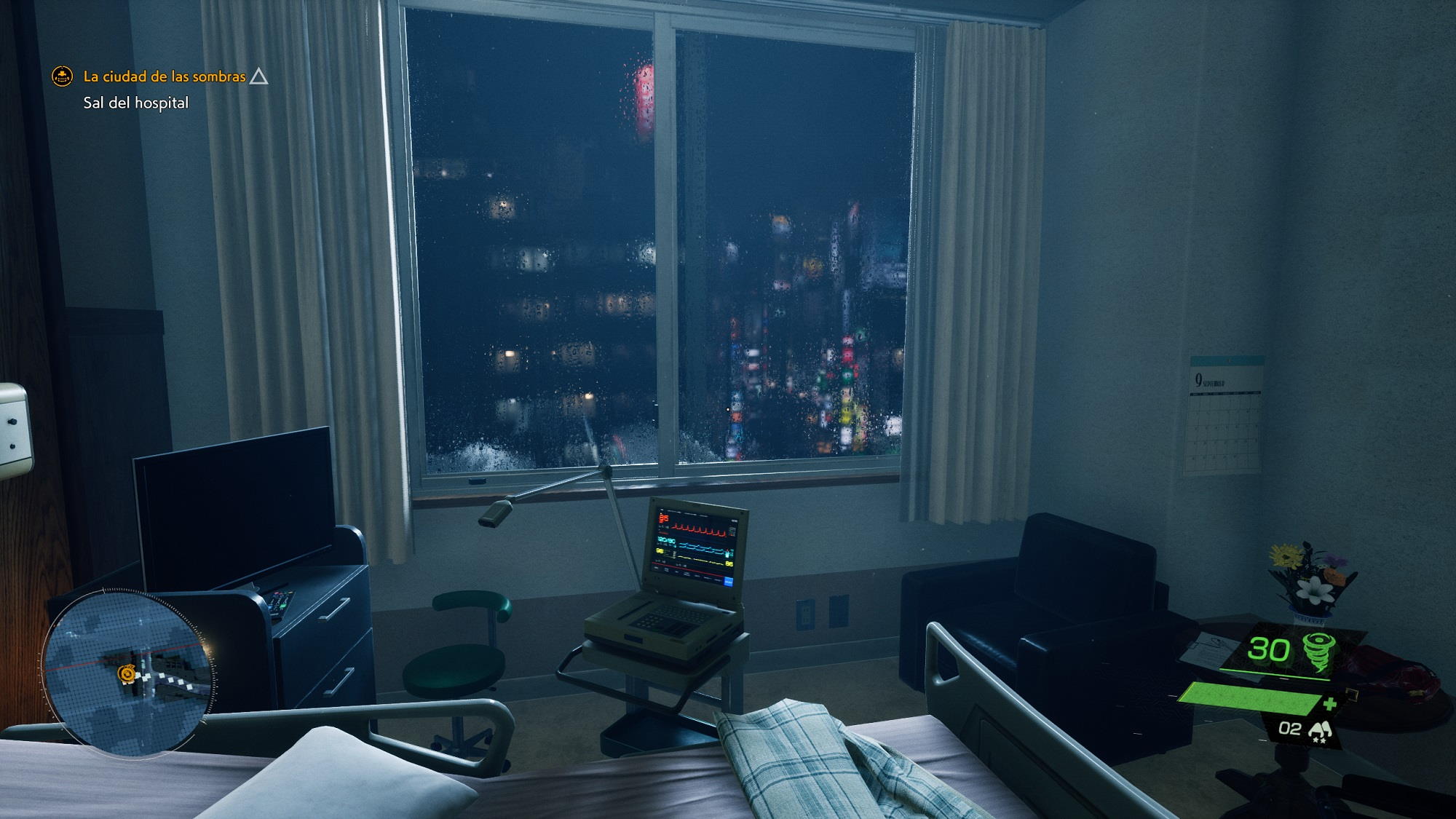 Para ilustrar esto solo tenemos que echar un ojo a la escena de la cama del hospital. Fijaros en lo cuidados que están todos los detalles, tanto que se aprecian hasta los pliegues de la sábana en la cama. La geometría de todos los objetos raya a un buen nivel, incluso aquellos más complejos como el mando a distancia que está al lado de la televisión, el jarrón con flores y la máquina que realiza el seguimiento del ritmo cardíaco. También podemos ver Tokio a través de la ventana con un efecto tan realista que podría pasar perfectamente por una fotografía.