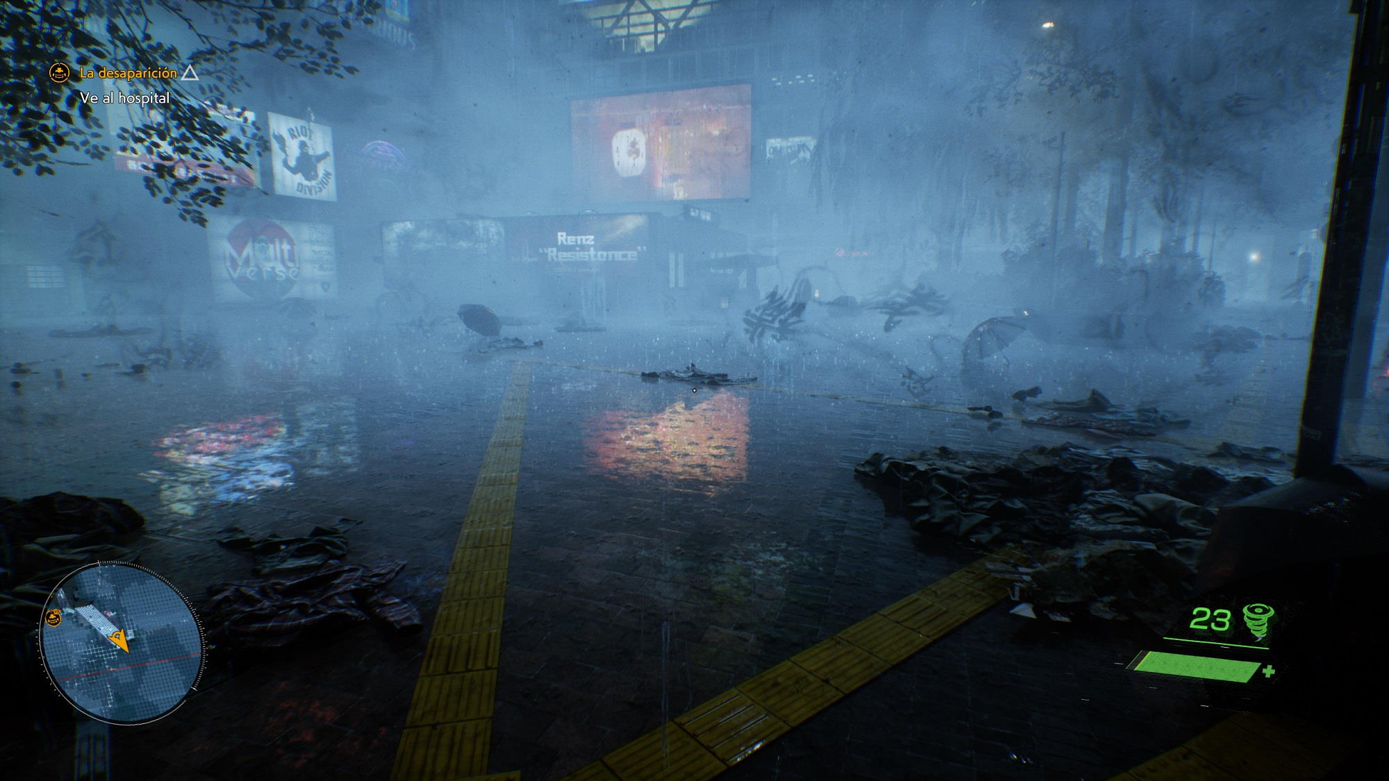 Pero eso no es todo, los reflejos también se generan de una manera mucho más realista y tienen una calidad simplemente impresionante. El trazado de rayos permite mostrar incluso reflejos de forma dinámica, como la pantalla con la presentadora de noticias en movimiento, algo que podéis apreciar en el vídeo que encontraréis al final del artículo, y diferencia a la perfección los reflejos que se producen en superficies más reflectantes, como los charcos de agua, de aquellos que tienen lugar en superficies rugosas, como el asfalto húmedo. Así, los reflejos en los charcos son más intensos y tienen un toque espejo más marcado, mientras que los otros tienen un acabado más apagado y menos nítido.