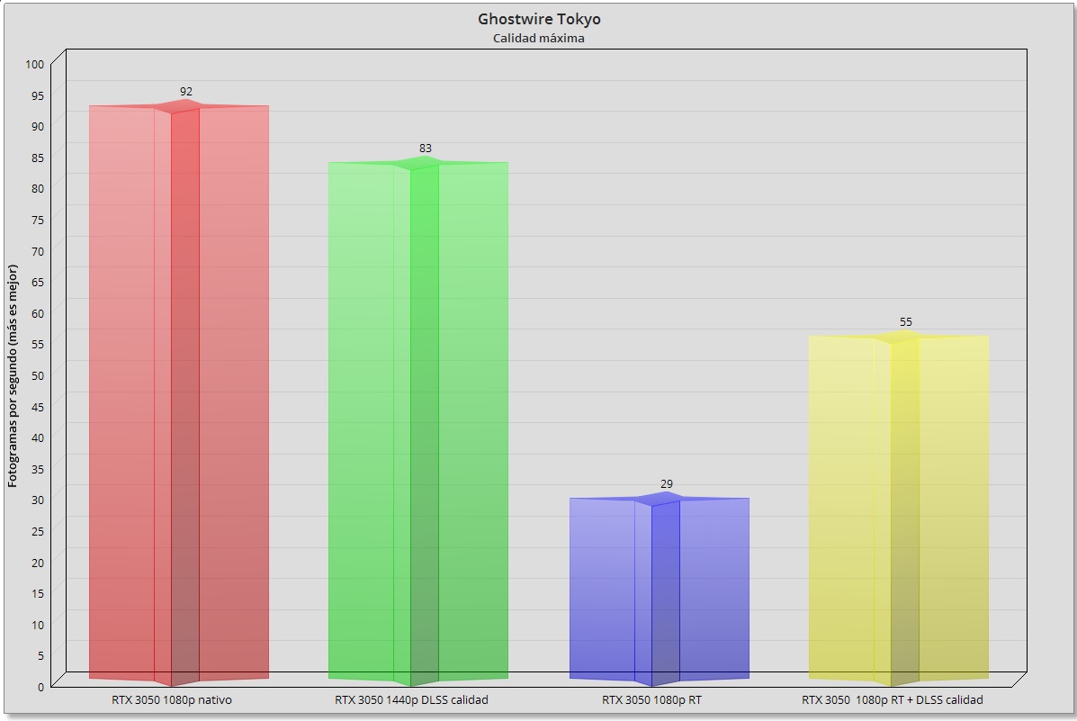La GeForce RTX 3050 es capaz de mover Ghostwire Tokyo sin problemas en 1080p con calidad máxima y trazado de rayos desactivado, y gracias al DLSS también ofrece una experiencia perfecta en 1440p. Cuando activamos el trazado de rayos el impacto que esta tecnología tiene en el rendimiento es enorme, y necesitamos del DLSS para poder compensarlo.