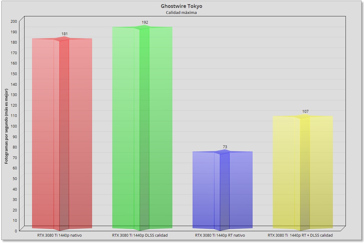 La GeForce RTX 3080 Ti demuestra que está en otro nivel, y es capaz de mover Ghostwire Tokyo incluso en 1440p nativo con trazado de rayos al máximo sin despeinarse, aunque es cierto que también vemos un gran impacto en el rendimiento al activar dicha tecnología. Por suerte, el DLSS en modo calidad es más que suficiente para compensarlo. Como nota curiosa, la GeForce RTX 3080 Ti va tan sobrada en 1440p que el DLSS en modo calidad apenas mejora el rendimiento, aunque reduce el uso de la GPU al 75%.