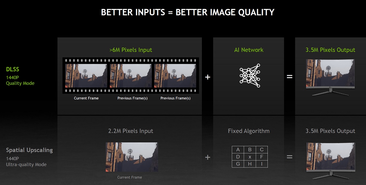 - El DLSS reconstruye y reescala la imagen utilizando inteligencia artificial para elegir y combinar los mejores fotogramas, y utilizando tanto elementos espaciales como temporales.