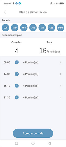 - Programar comidas. Programa las horas a las que el gato comerá en un ciclo de 7 días. Permite programar hasta 12 comidas al día.