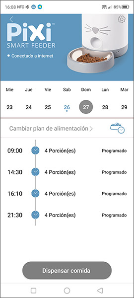 - Resumen de alimentación. Visualiza cuándo será la próxima comida programada y si el comedero contiene suficiente comida en el momento actual.