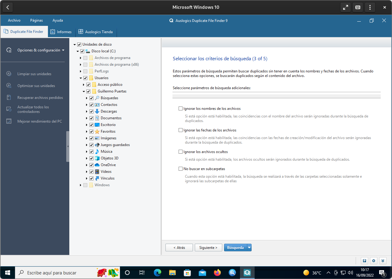 Una vez dentro, lo suyo es desmarcar C:\*.* para evitar la búsqueda de ficheros del sistema duplicados. Luego se pulsa sobre el botón “Añadir” para seleccionar el carpeta personal del usuario (C:\Users\“Nombre del usuario” o Escritorio > “Nombre de usuario”, Guillermo Puertas en nuestro caso) como punto de partida y hay que asegurarse de tener seleccionado “Incluir archivos y subcarpetas” en el desplegable de Opciones.