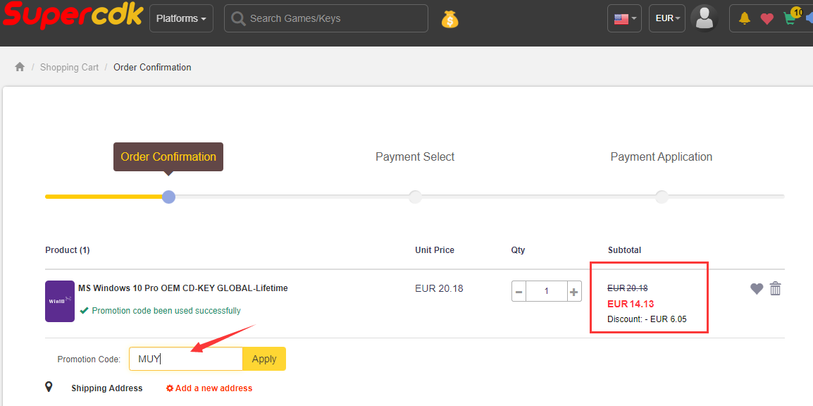 - Introduce en el campo «código de promoción» el cupón mencionado de «MUY» (sin las comillas).