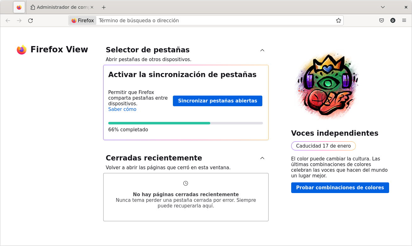 Otra novedad interesante es Firefox View o Vista de Firefox, que ayuda al usuario a volver al contenido que descubrió con anterioridad. Mozilla explica que “una pestaña anclada le permite buscar y abrir pestañas cerradas recientemente en su dispositivo actual, acceder a pestañas desde otros dispositivos (a través de nuestra función «Recoger pestañas») y cambiar el aspecto del navegador (con combinaciones de colores)”.