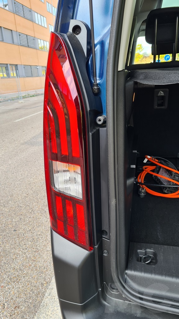 En parte este inconveniente se salva gracias a que la luna del mencionado portón también se puede abrir accionando otro pulsador junto al de la apertura. De esta forma podemos acceder al interior pero de forma más incómoda ya que el suelo del maletero queda muy bajo. Para dejar el máximo espacio de apertura los grupos ópticos traseros son de diseño vertical. En la parte inferior el parachoques en plástico negro envuelve la parte de abajo del portón. Debajo del parachoques una defensa de plástico gris remata esta parte de la e-Rifter.