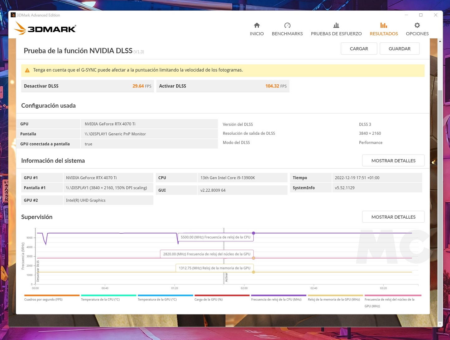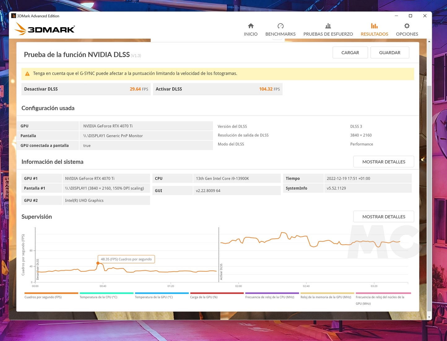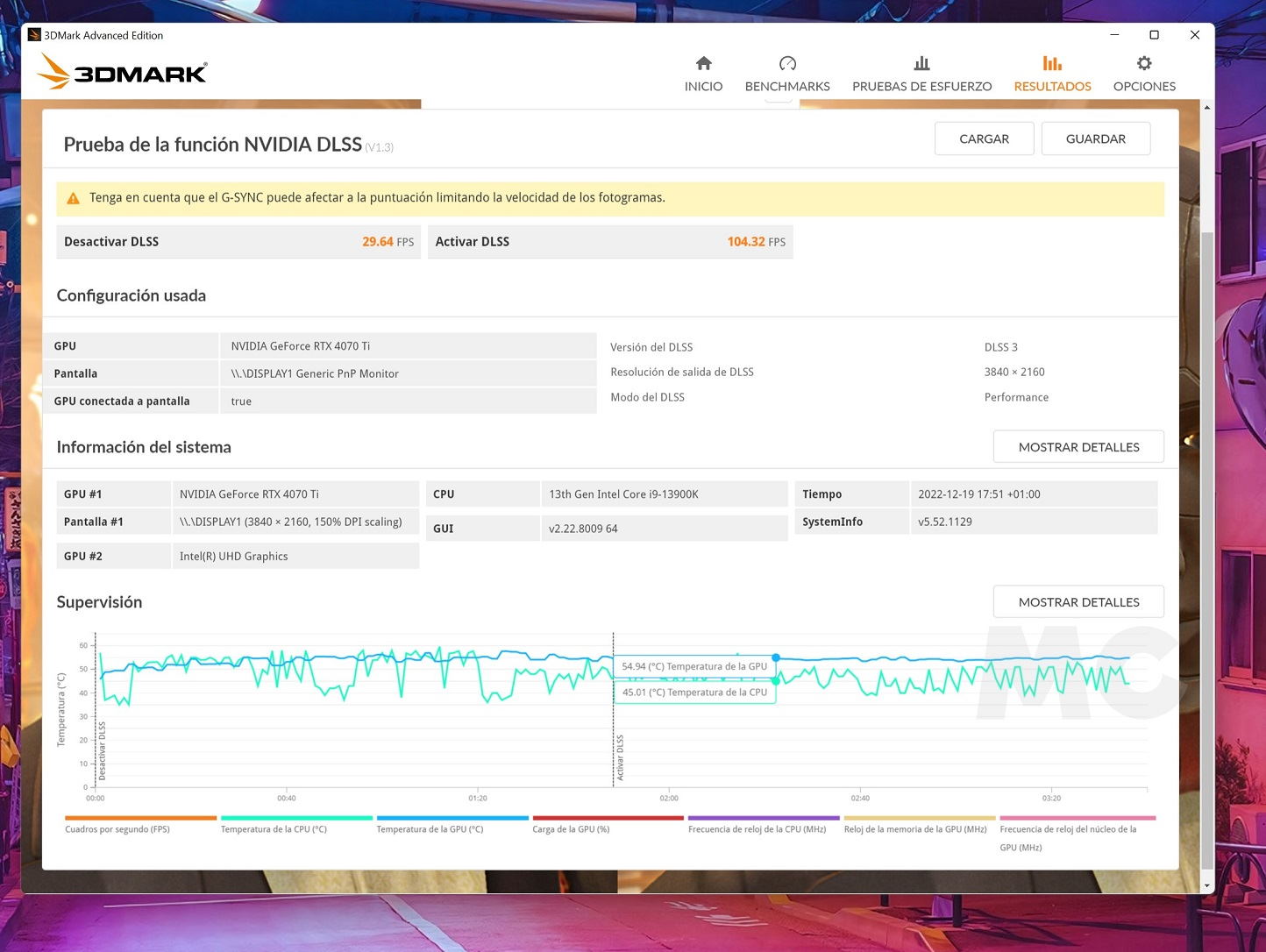 Empezamos nuestra ronda de pruebas de rendimiento con todo un clásico, 3DMark en su modalidad para DLSS 3. Con esta prueba podremos medir el rendimiento que es capaz de ofrecer la GIGABYTE GeForce RTX 4070 Ti GAMING OC, y veremos también la diferencia que marca dicha tecnología de NVIDIA gracias a la generación de fotogramas.
