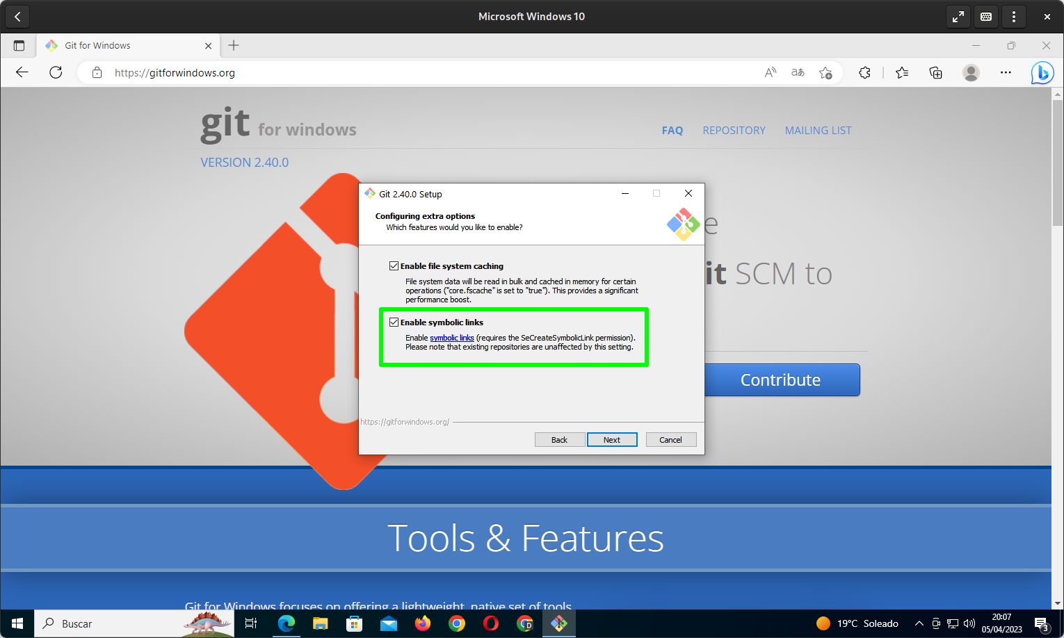 En el paso de configuración de opciones extra (Configuring extra options) he seleccionado que se habiliten los enlaces simbólicos (Enable Symbolic links), mientras que de las opciones experimentales no he marcado nada.