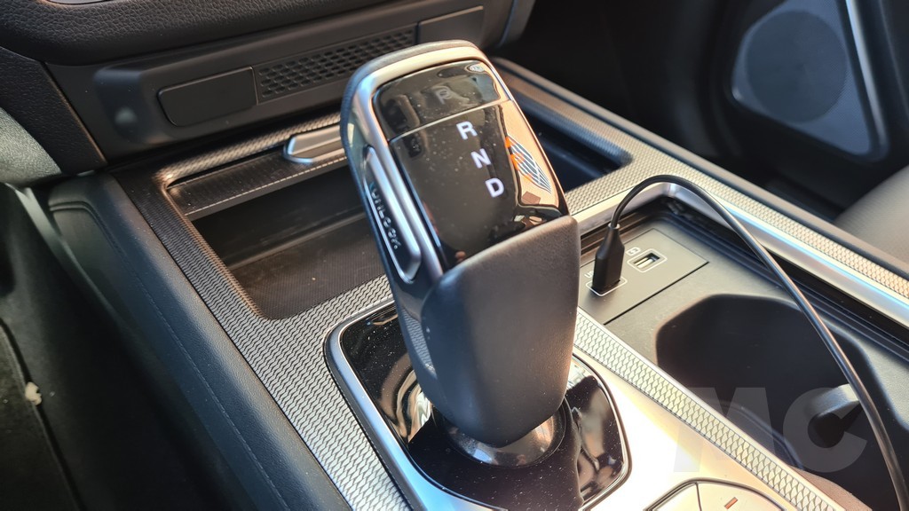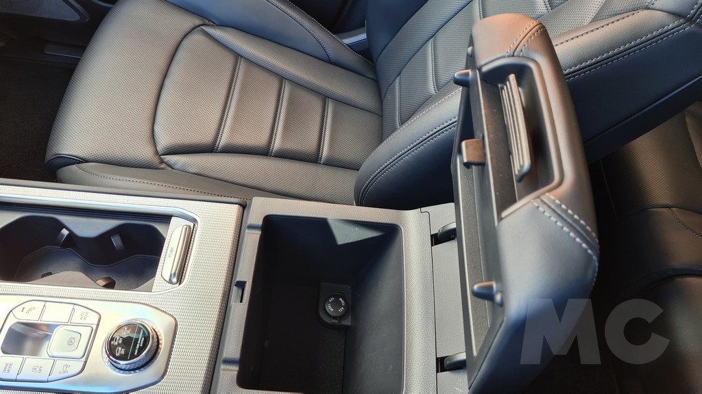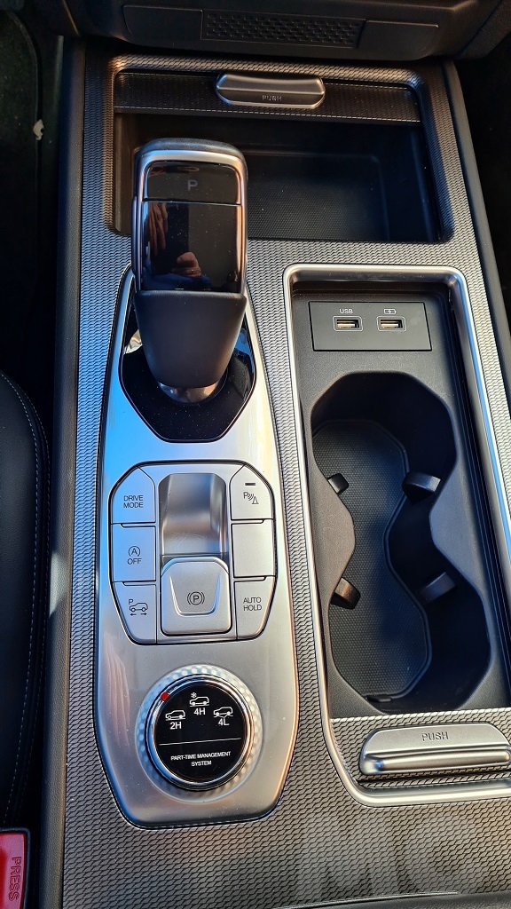 La consola central de la que ya hemos hablado acoge el selector del cambio además de varios botones para accionar los distintos modos de funcionamiento además de un dial que permite elegir entre distintos funcionamiento de la transmisión, con dos ruedas motrices, cuatro ruedas motrices o cuatro con reductora. La consola acoge también un pequeño hueco para guardar objetos que tiene tapa corrediza en la parte delantera y junto al selector del cambio otro hueco más alargado también con tapa que oculta los posavasos y los conectores USB.