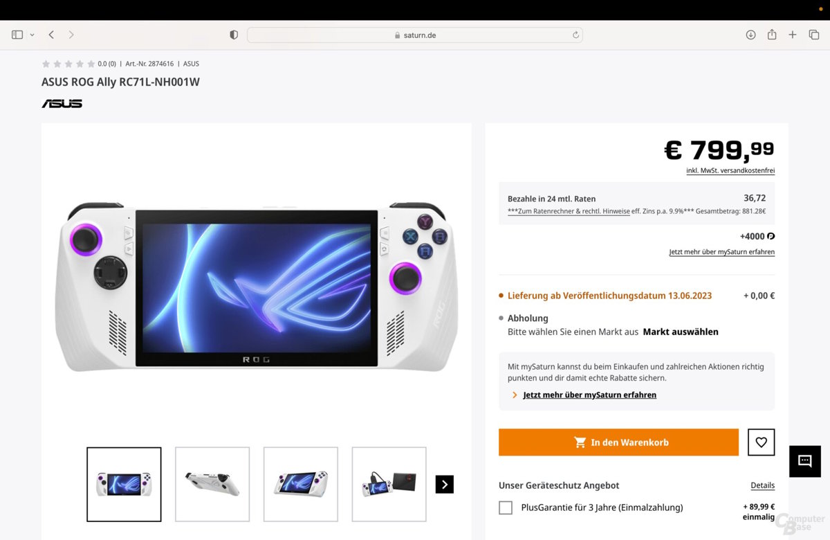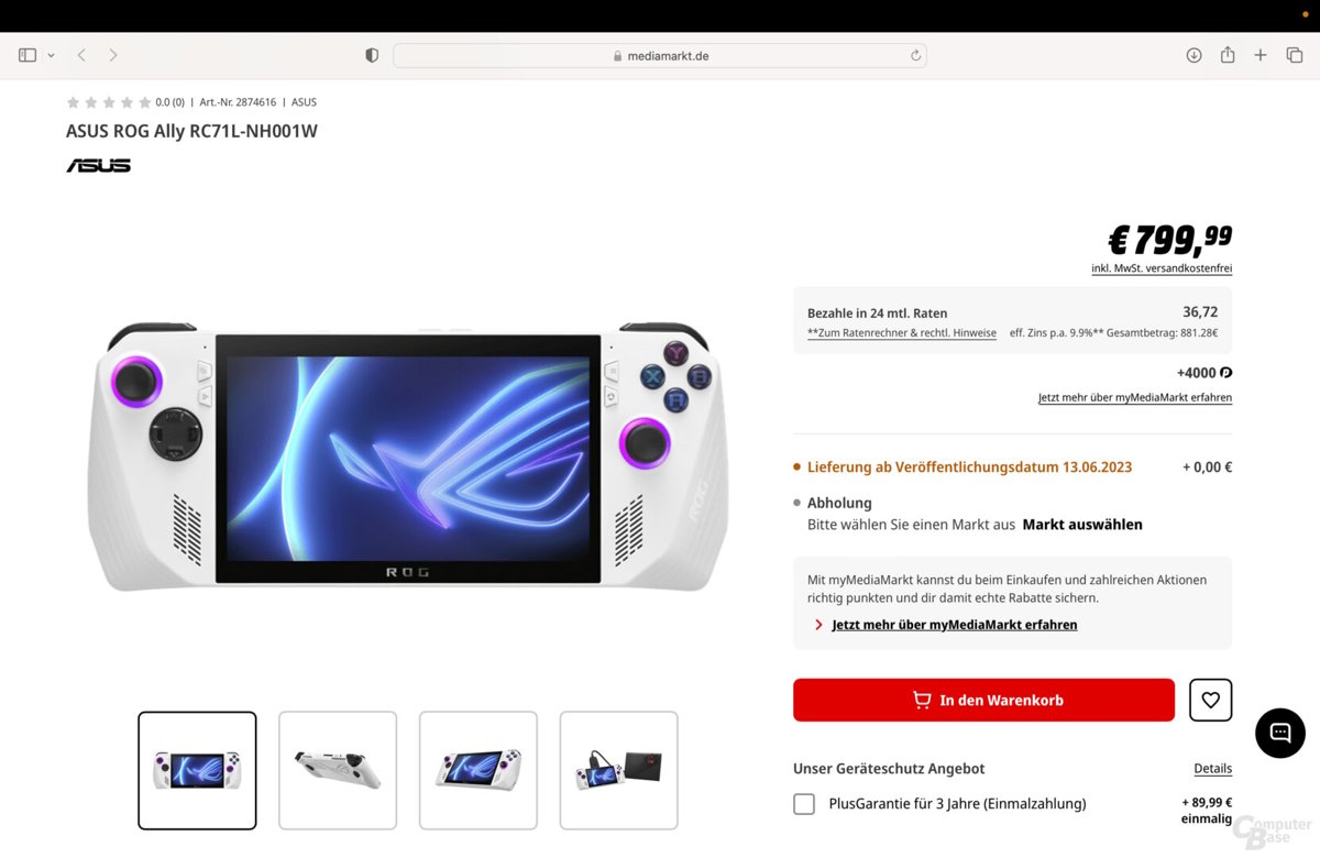 Los rumores más sólidos apuntaban en su momento a un precio para Estados Unidos de 650 dólares, una cantidad que subiría como mínimo en 100 cuando la ASUS ROG ALLY llegara a la Eurozona y tuviera un precio en euros. El medio alemán Computer Base ha logrado hacerse con dos pantallazos de dos tiendas diferentes que operan o que tienen representación en el mismo país: Mediamarkt y Saturn.