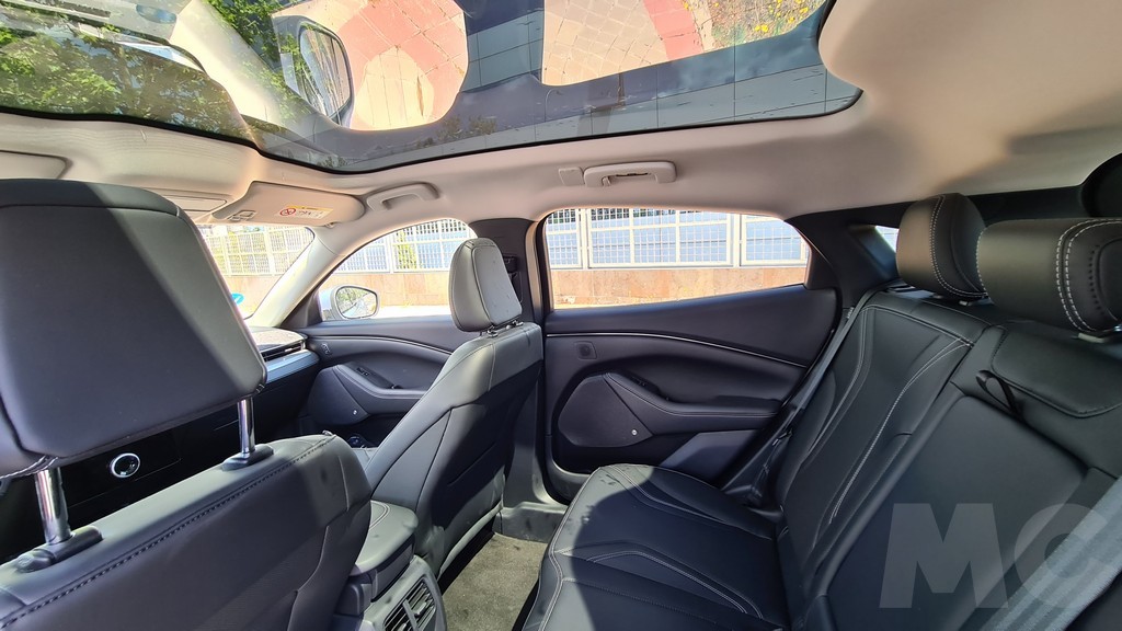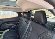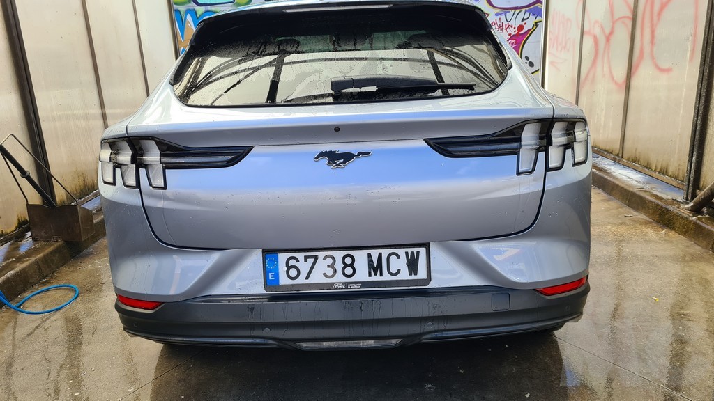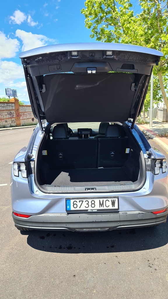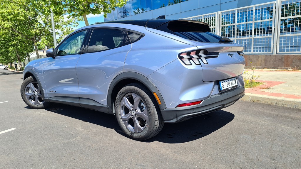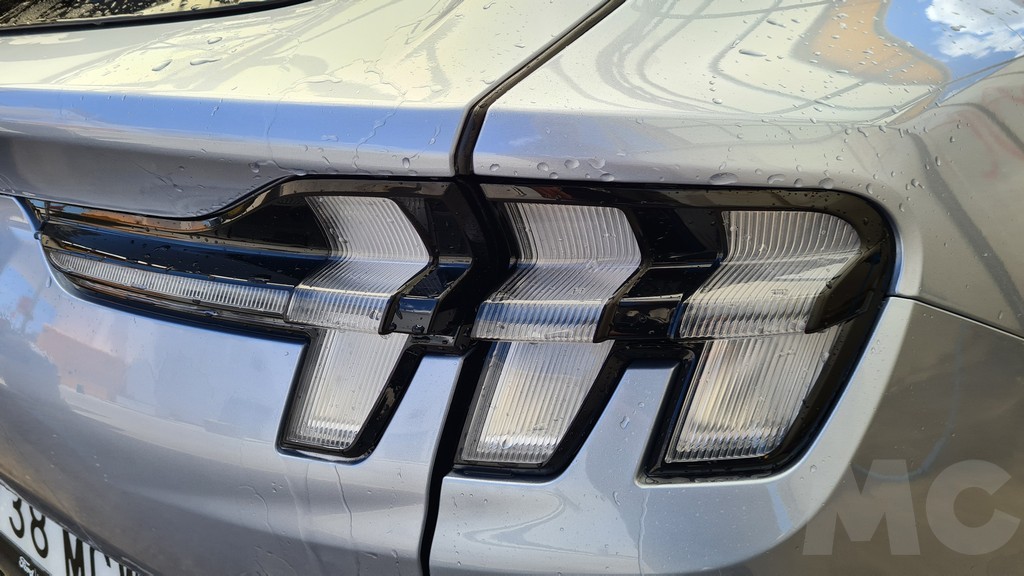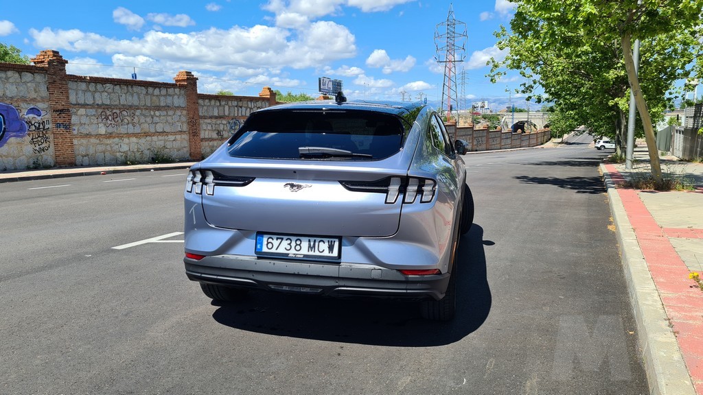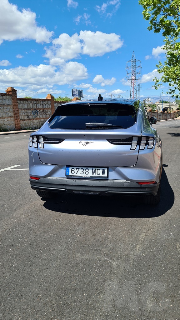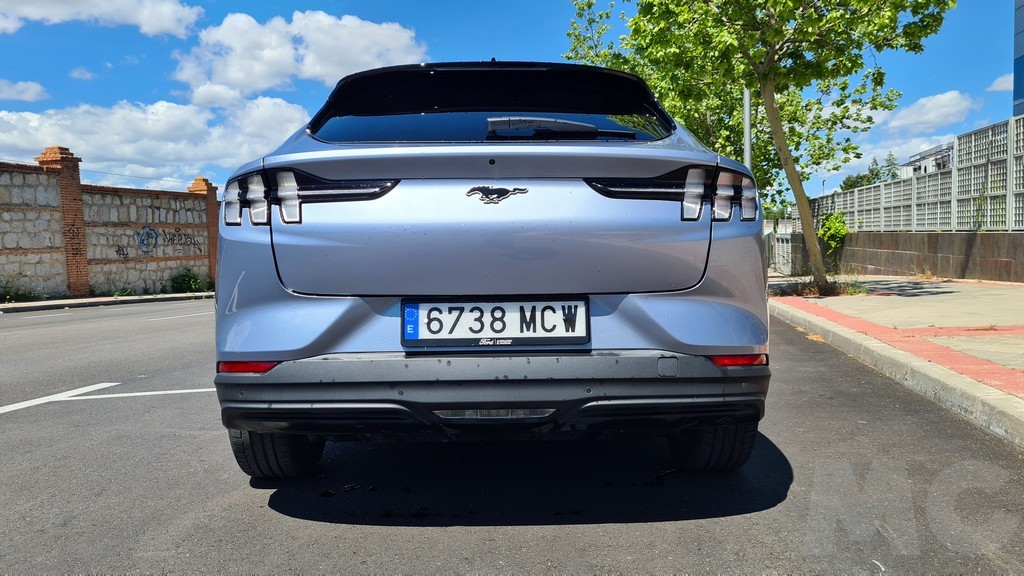 En la parte trasera vuelve decidido el guiño hacia el Mustang deportivo sobre todo en la parte de los grupos ópticos alargados atravesados por tres elementos verticales que recuerdan a los que lucen las versiones deportivas con motor de combustión. Aquí también manda la imagen del caballo de raza Mustang en la parte central del portón del maletero que se inclina desde el spoiler que domina la parte superior de la luna trasera hasta un segundo spoiler que protege los grupos ópticos que ya hemos mencionado. Un amplio paragolpes remata esta parte trasera.