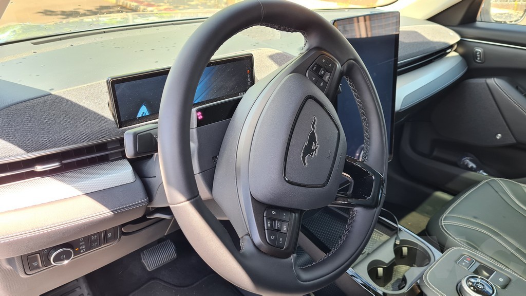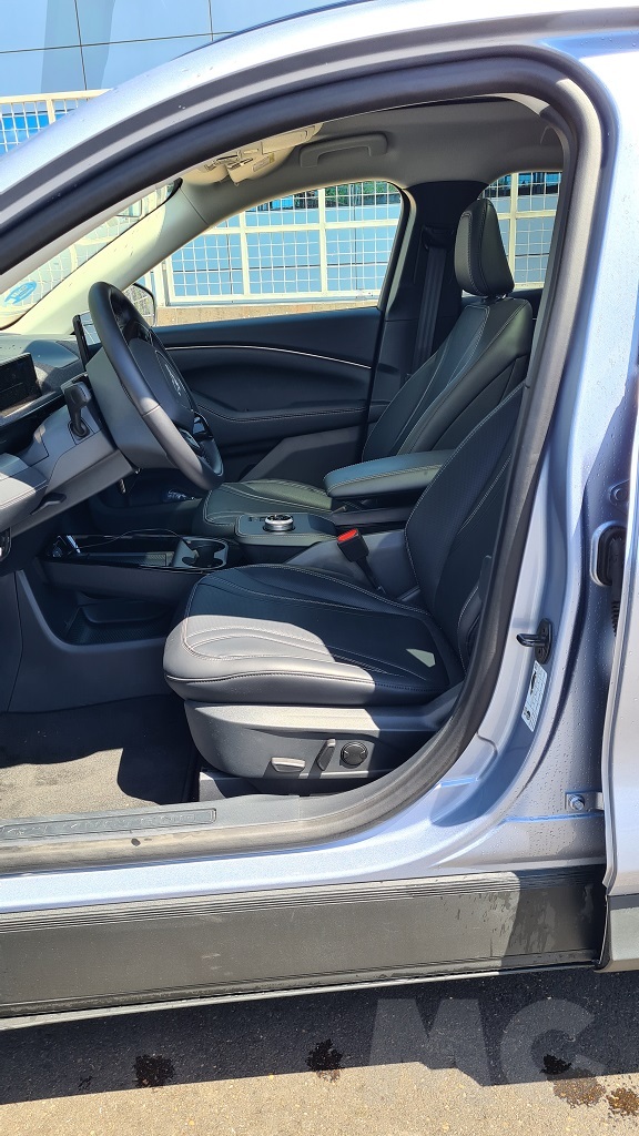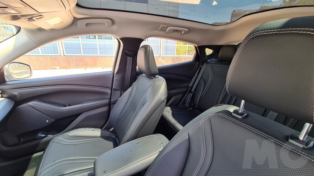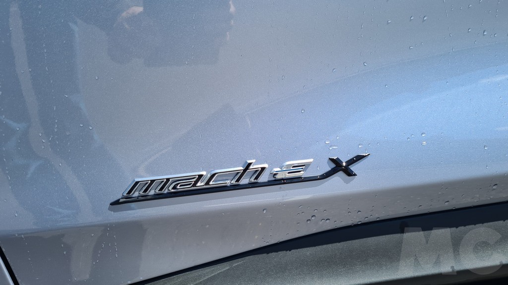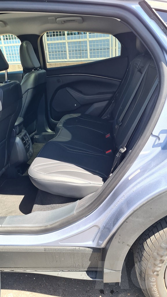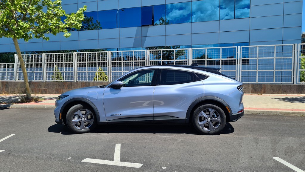 El perfil de este SUV / deportivo / eléctrico tampoco renuncia a la deportividad. Destaca el morro alargado, las llantas de 18 pulgadas con el logotipoo de Mustang en el centro, una línea aerodinámica que desciende en la parte trasera hasta un alargado spoiler en color negro, cristales tintados traseros y unos relieves en la carrocería en la parte inferior de las puertas y sobre el guardabarros trasero que le dan un aire dinámico muy peculiar y una personalidad difícil de encontrar en este tipo de vehículos. También notable es la ausencia de manijas para la apertura de las puertas, hay botones para abrirlas una vez desbloqueadas.
