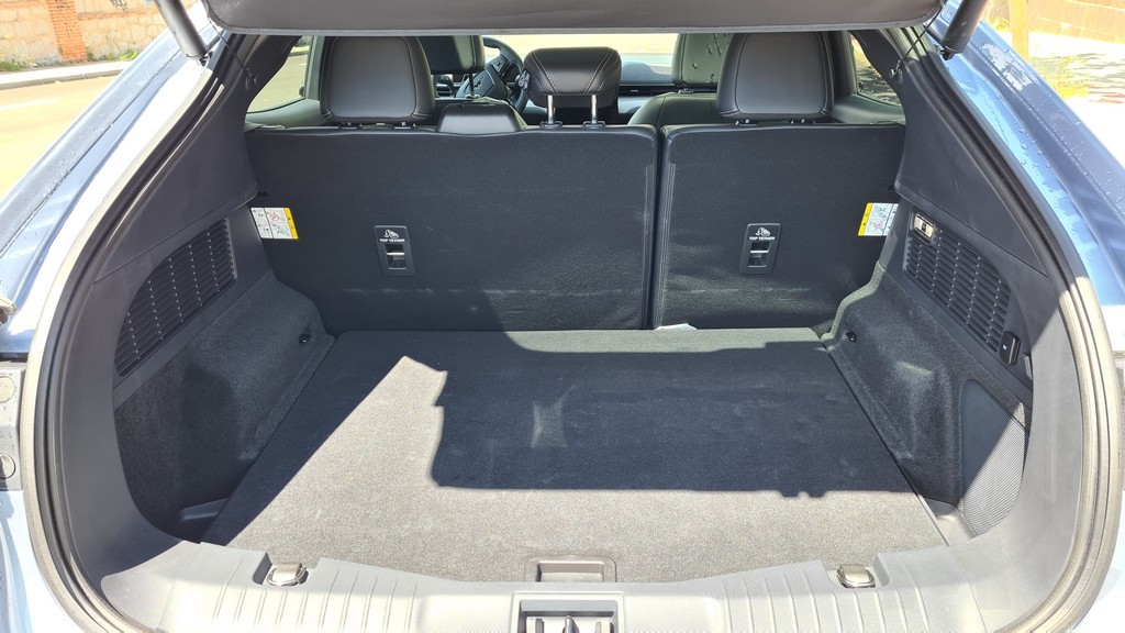 El Mustang Mach-E dispone de dos maleteros, al igual que los modelos de Tesla. El delantero es pequeño y tiene bastante espacio disponible, hasta 81 litros. Se trata de un espacio ideal para objetos que siempre llevamos en el coche pero que no queramos que estén en el maletero principal ocupando espacio y moviéndose, como por ejemplo los cables de carga. El maletero de la parte trasera tiene una capacidad de 402 litros con unas formas muy regulares y sin obstáculos lo que hace que sea fácil introducir objetos. La cortinilla que hace de tope superior del maletero se levanta cuando se abre el portón que se abre con un motor eléctrico.