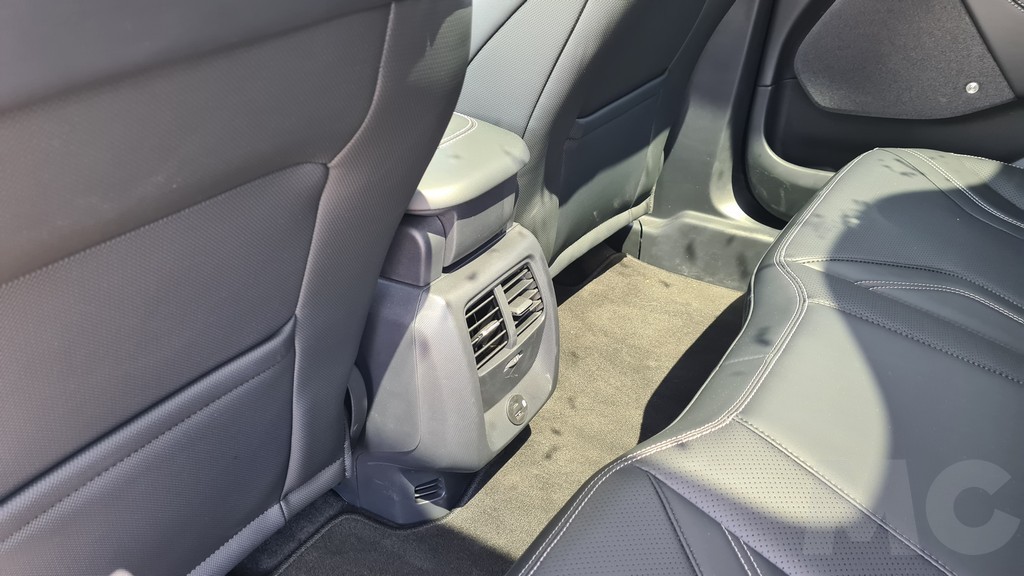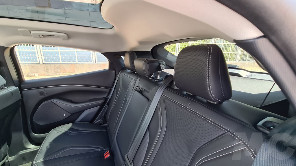 En la parte posterior el acceso a las plazas es algo más complicado que en un SUV tradicional por su diseño más aerodinámico, pero el hueco es amplio. Una vez dentro el espacion es bueno tanto en altura como en anchura o espacio para las piernas. La ausencia del túnel central de la transmisión hace que la plaza central sea más cómoda (como ocurre en todos los coches con propulsión eléctrica). Las plazas traseras disponen de dos salidas de aire en la consola central además de dos conexiones USB y USB-C para la carga de dispositivos.
