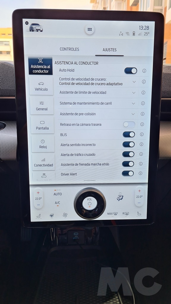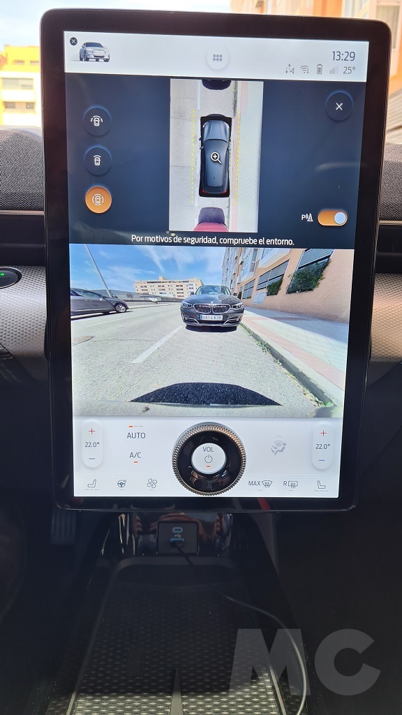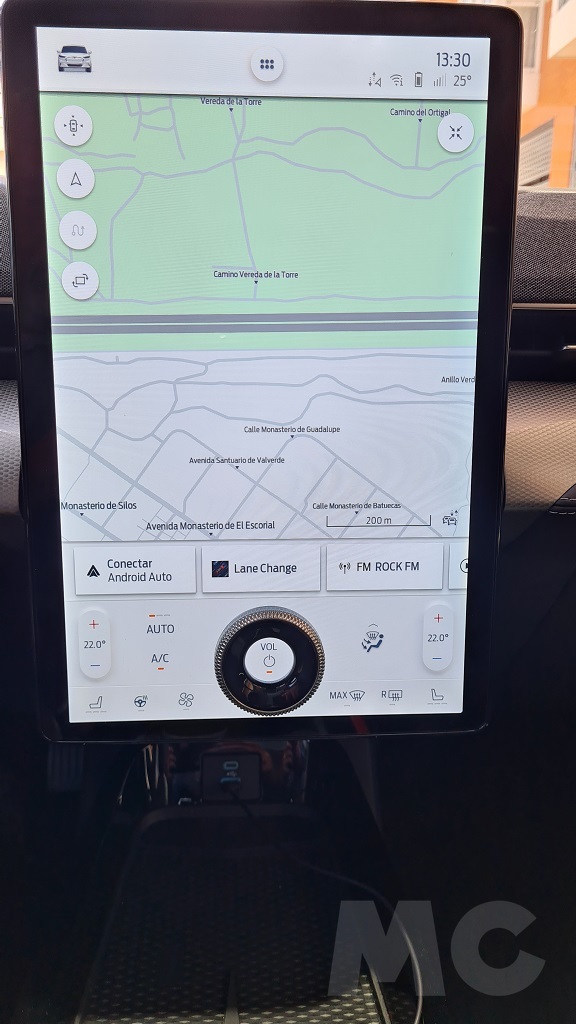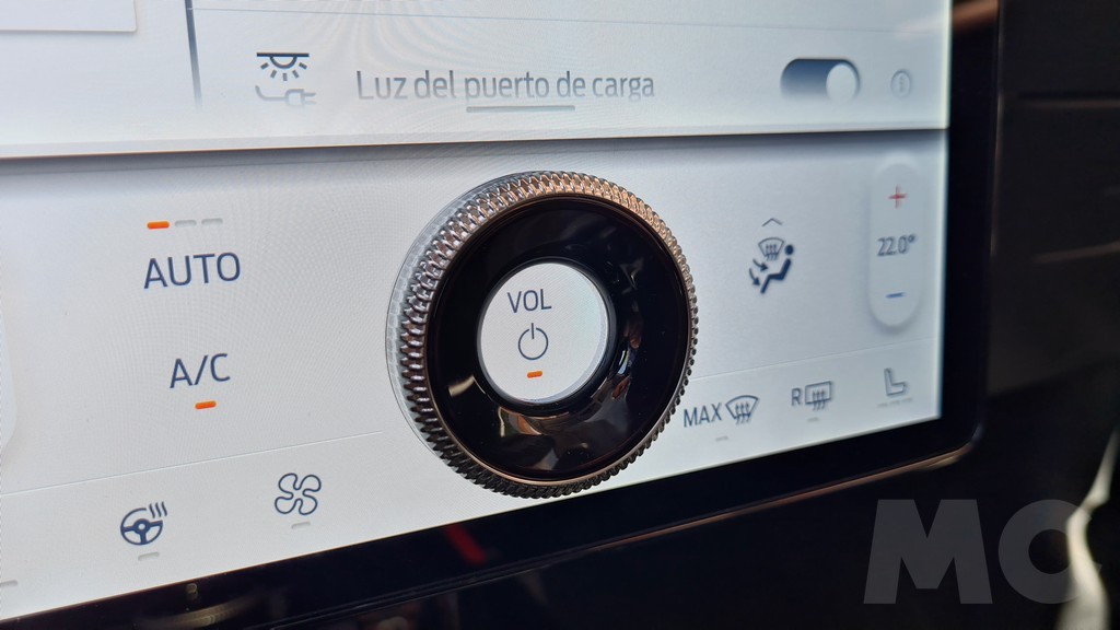 La pantalla siempre muestra en la parte superior una franja en la que podemos leer información como la hora, la temperatura o el estado de carga así como acceso a la forma de disponer las opciones del menú en pantalla. En cambio en la parte inferior en la zona del dial que ya hemos mencionado se encuentra una zona de controles del sistema de climatización además del mencionado dial para controlar el volumen de reproducción del sistema multimedia con la posibilidad de apagarlo pulsando en el centro.