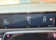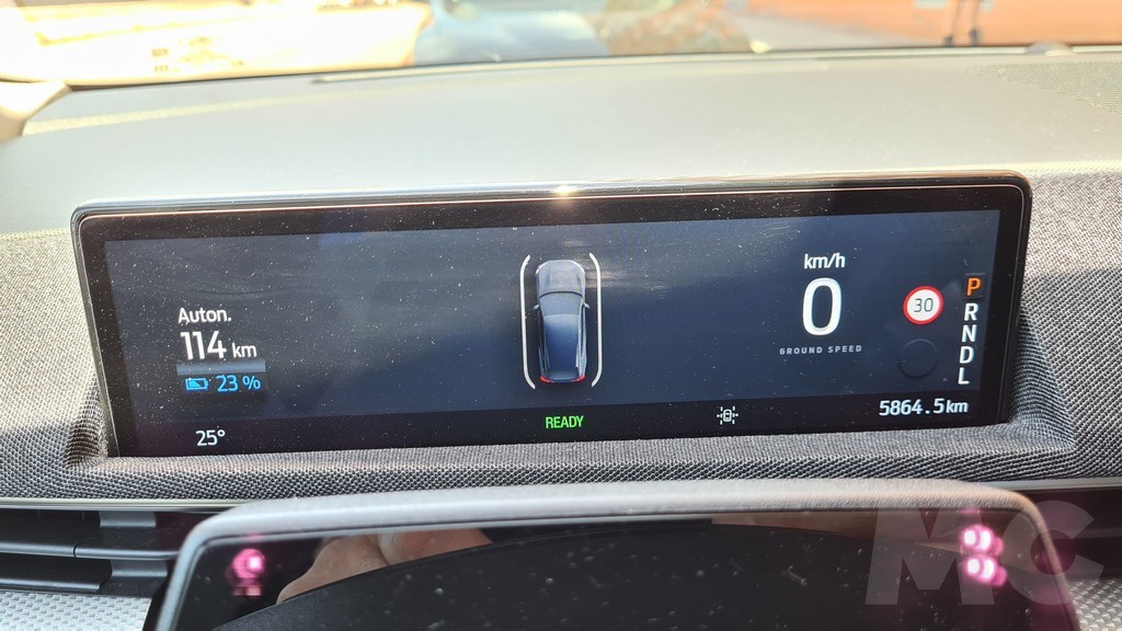 El salpicadero tambien tiene un diseño minimalista y de líneas rectas que recorren horizontalmente la parte delantera y que se ven interrumpidas solamente por la mencionada pantalla vertical y la que se encuentra detrás del volante y que integra las funciones de los indicadores tradicionales. Esta pantalla de 10,2 pulgadas muestra información de viaje como velocidad, autonomía, información de los sensores y radares del coche, indicaciones del navegador (también de Android Auto si está conectado) y otros datos como temperatura ambiente y el funcionamiento de luces o limpiaparabrisas. No dispone de indicación del modo de funcionamiento del sistema eléctrico del coche (descarga de potencia o recuperación).