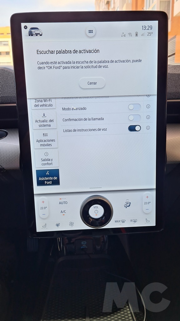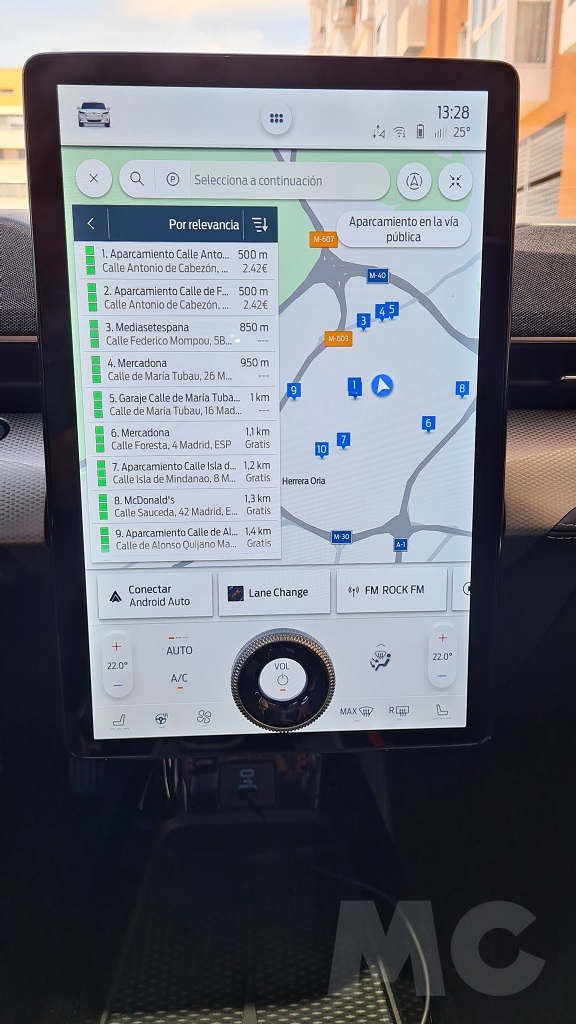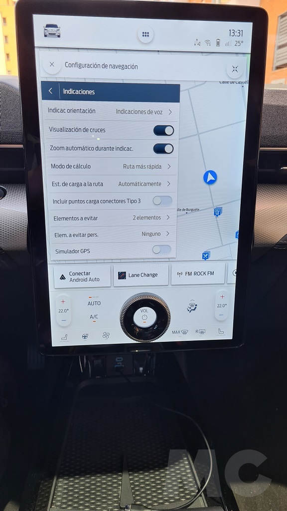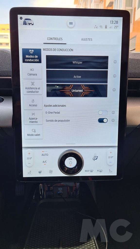 Las funciones a las que podemos acceder desde esta pantalla son muchas así como multitud de datos de funcionamiento del coche. Hay una sección en la que podemos seleccionar distintas opciones de configuración de los controles como modos de conducción, acceso al interior del coche, sistema de asistencia y otros además de poder elejir distintos ajustes del Mustang como los del sistema de sonido o las opciones de carga. También podremos acceder a un excelente navegador bien orientado a poder encontrar puntos de carga públicos.