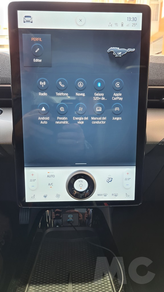 En el interior el Mustang luce una mezcla de detalles con inspiración deportiva y toques estéticos modernos y casi futuristas. En este aspecto domina una gran pantalla de 15,5 pulgadas dispuesta en vertical en la parte central del salpicadero en cuya parte inferior se ha incrustado un dial que se integra en la pantalla y sirve para el control de volumen. Una decisión de diseño algo extraña porque rompe el minimalismo estético del monitor para aportar una funcionalidad que podría haberse resuelto de otra manera. Tiene detractores y defensores pero su funcionamiento es bueno.