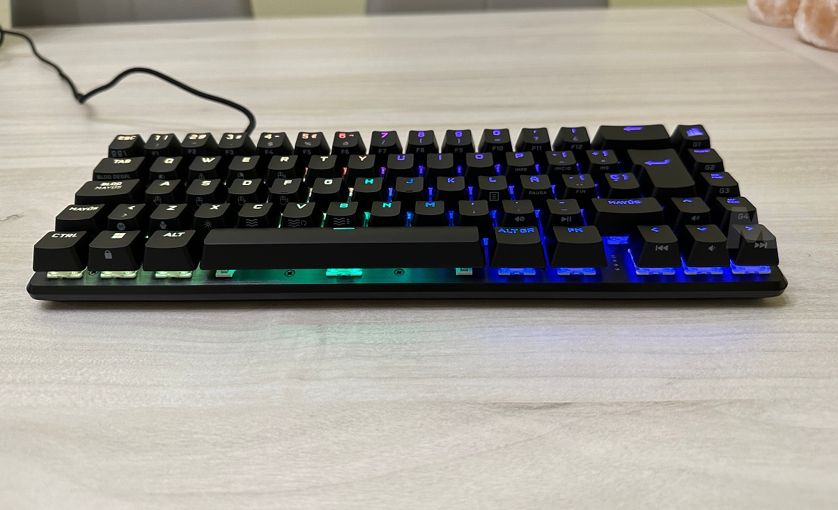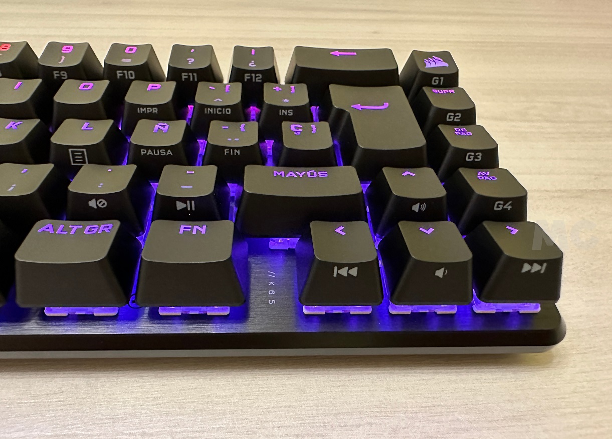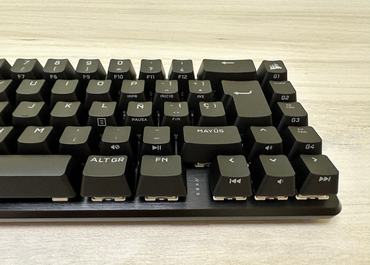En el lateral se han incluido las teclas «Suprimir», «Subir Página» y «Bajar Página», y también una tecla dedicada de Corsair. Estas cuatro teclas pueden funcionar además como teclas «G», a las que podemos asignar funciones concretas a través de la aplicación iCUE. Por razones obvias, este teclado no cuenta con teclas dedicadas para multimedia, pero las flechas de dirección pueden trabajar como tal gracias a sus funciones secundarias.
