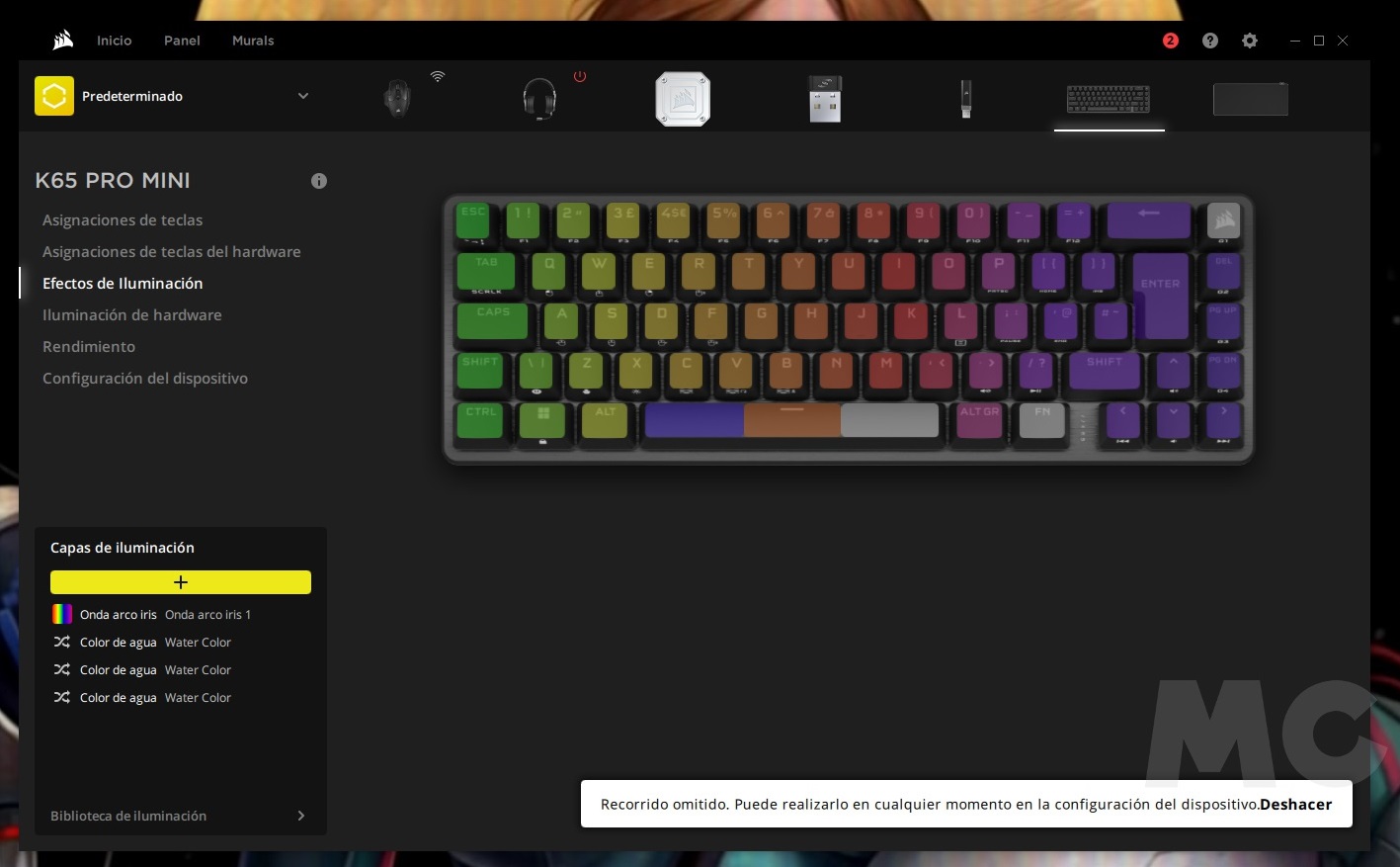 La calidad de la iluminación LED RGB está a la altura del conjunto, y podemos personalizarla fácilmente con los perfiles predefinidos que incorpora iCUE. Si tenéis tiempo y os gusta personalizar al máximo vuestros periféricos no hay problema, también podréis crear patrones personalizados por tecla y aplicar efectos muy diversos. Por otro lado la creación de macros y la asignación de funciones a las teclas adicionales también funcionan a la perfección.