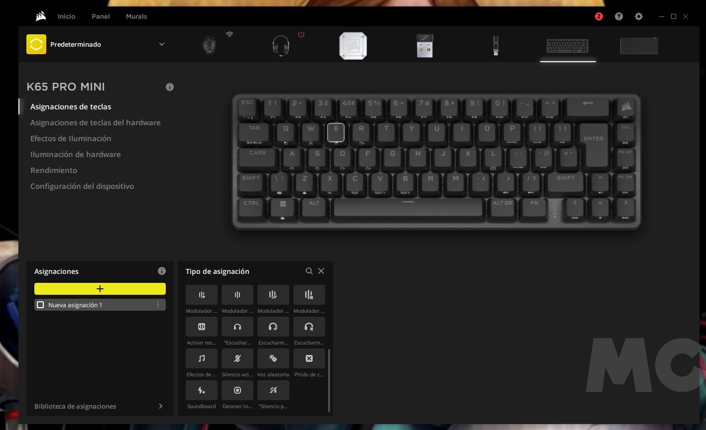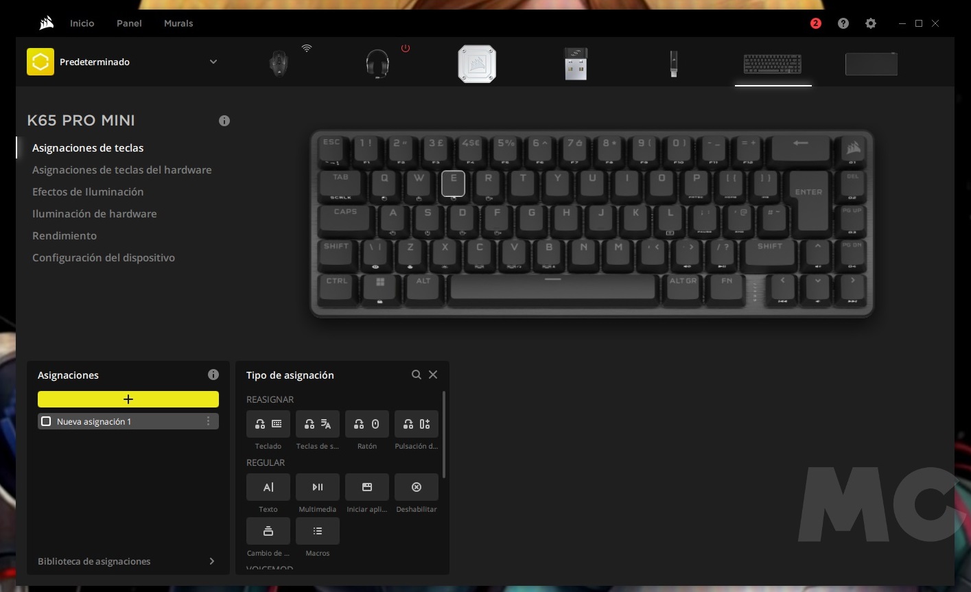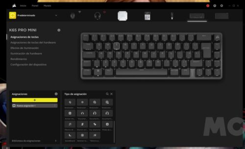 - Realizar asignaciones de teclas: es muy útil, ya que con esto podemos asignar funciones específicas a teclas concretas, y podemos guardar esas asignaciones tanto a nivel de software como de hardware. En el primer caso podremos acceder a ellas cuando tengamos abierto iCUE, y en el segundo quedarán grabadas en la memoria del teclado, de manera que estarán disponibles aunque no podamos utilizar iCUE.