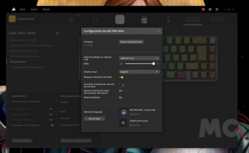 - Modificar la configuración del dispositivo: este es un menú muy importante, ya que a través de él podremos cambiar la distribución del idioma del teclado y la tasa de muestreo, activar el modo consola PlayStation, formatear la memoria del teclado, ajustar el brillo de la iluminación LED RGB y realizar actualizaciones de firmware.