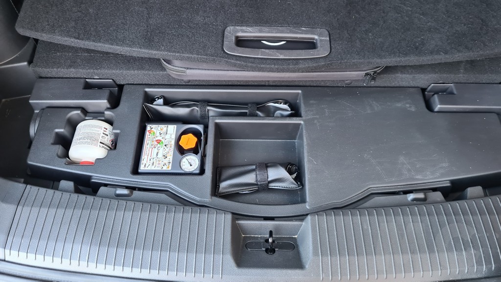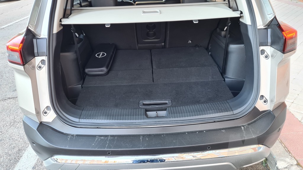 En lo que respecta al mencionado maletero esta nueva versión del X-Trail ofrece una capacidad de 485 litros, algo menos que la versión que solamente dispone de cinco plazas útiles. Si utilizamos las dos plazas adicionales el volumen se queda reducido hasta los 120 litros. Si en cambio abatimos tanto la tercera como la segunda fila de asientos nos encontramos que la capacidad de carga crece hasta los 1.298 litros. Se trata de un maletero de formas bastante regulares y bien aprovechable con algunos huecos útiles, como el que existe para el kit para los pinchazos.