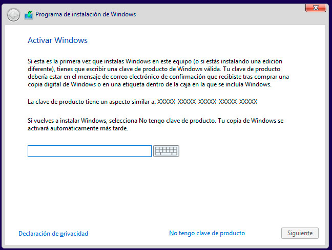 Escribe entonces, en el recuadro, la clave que has obtenido al comprar la licencia y sigue con el proceso de instalación de Windows 10 en el que te guiará el asistente. Al concluir el sistema operativo se habrá instalado y activado, de modo que ya podrás emplearlo sin limitaciones.