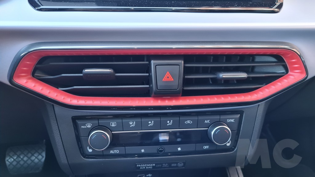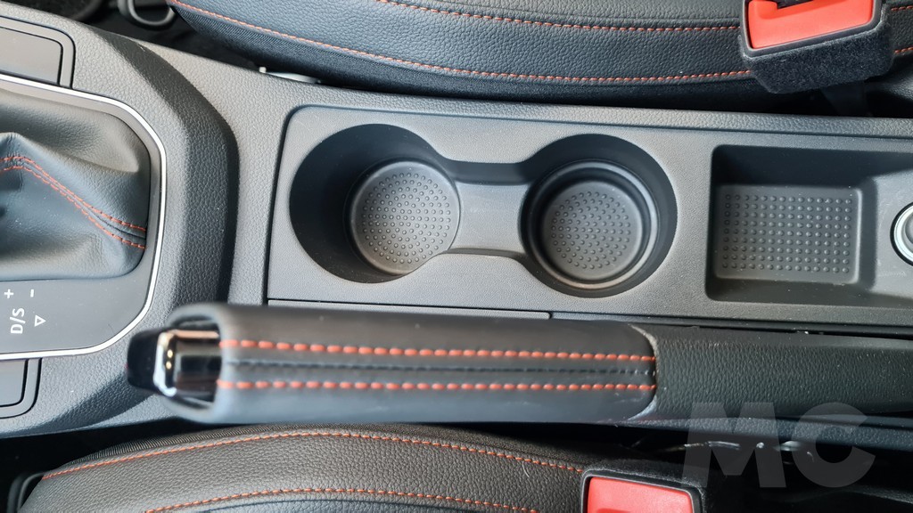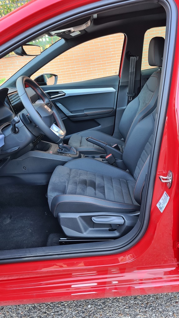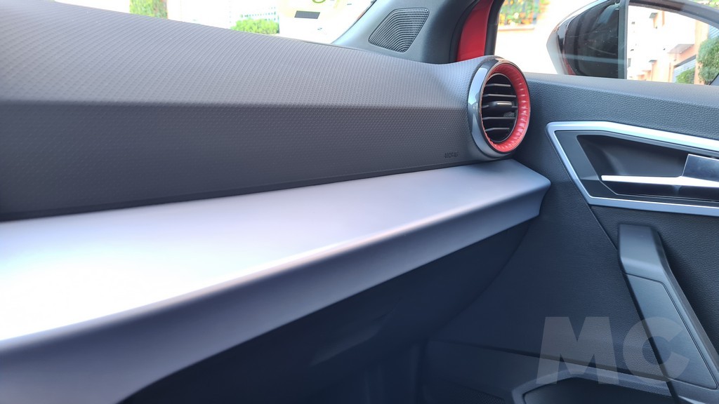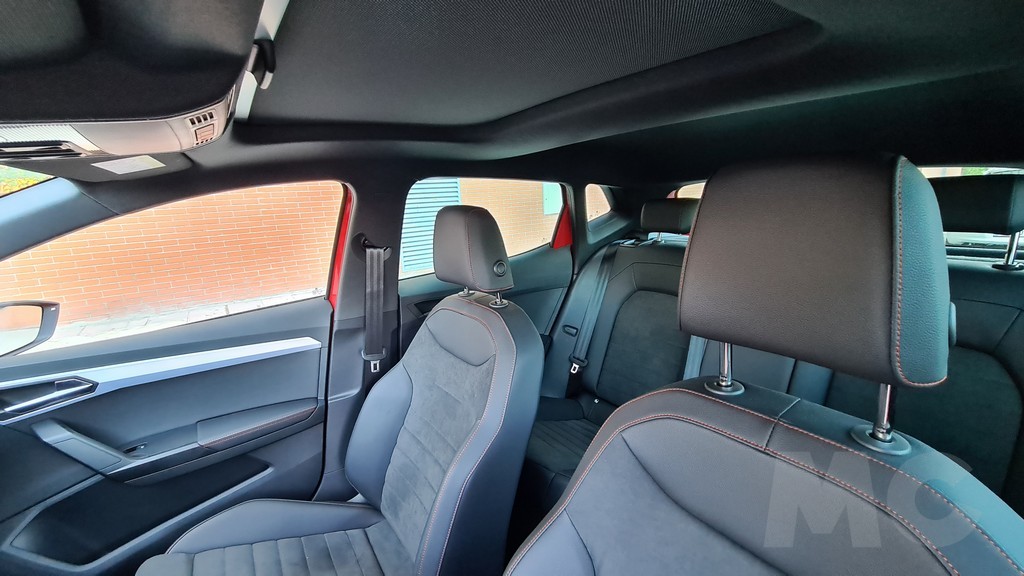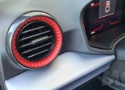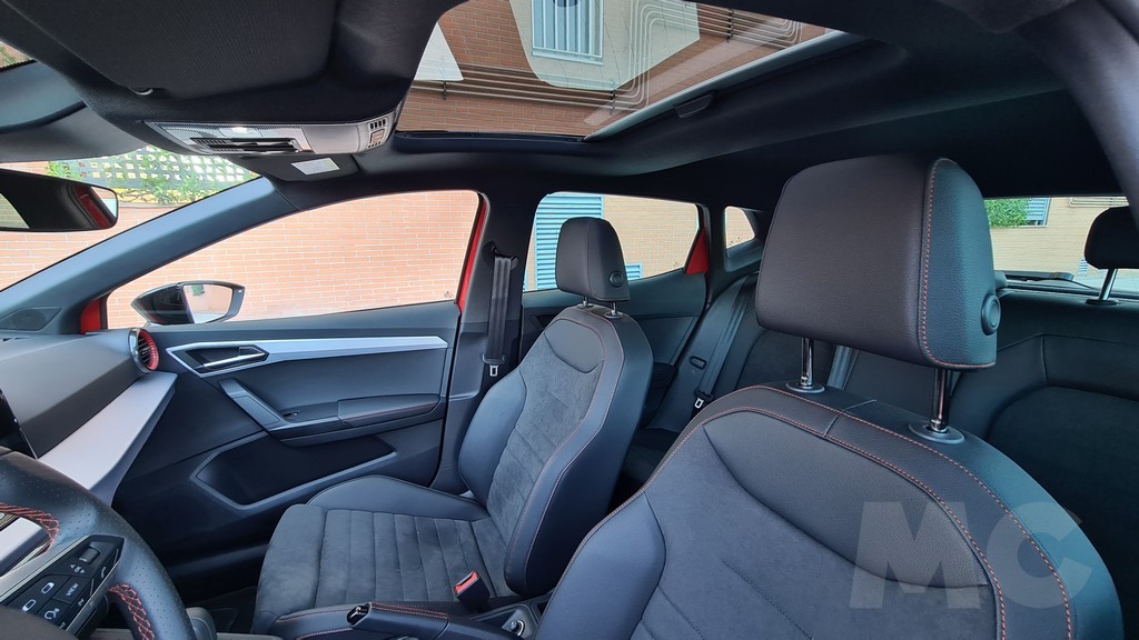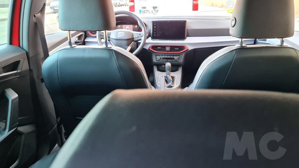 Encontramos detalles como acabados en material imitación de fibra de carbono o molduras en color rojo en los bordes de las salidas de aire del sistema de climatización y costuras también en color rojo tanto en la tapicería de los asientos como en el volante o los fuelles del cambio y de la palanca del freno de mano (que curiosamente es mecánica y no eléctrica). Los asientos delanteros aunque algo estrechos tienen un acolchado muy cómodo y diseño deportivo que envuelve en las curvas.