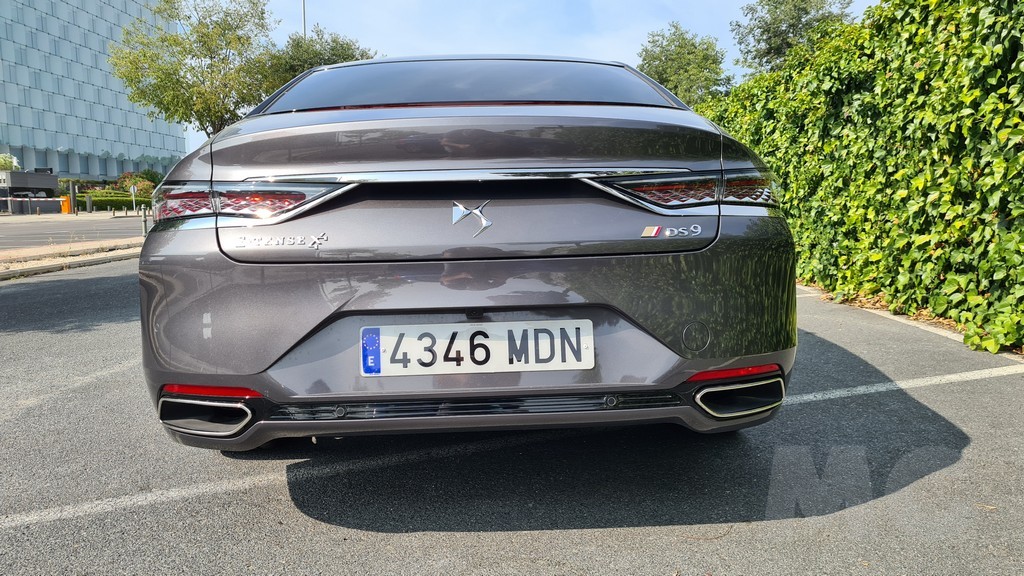 En la parte inferior de la luna trasera y ocupando toda su anchura se ha colocado una tercera y delgada luz de frenos. Como es habitual en los modelos de DS los grupos ópticos traseros lucen una cuadrícula de relieves con forma de rombo que le otorga un efecto tridimensional muy peculiar. Estos grupos ópticos quedan elevados y bajo ellos un amplio paragolpes que luce en el centro el emplema de la marca remata la zaga. Más abajo dos salidas de escape alargadas y cromadas añaden un toque más de exclusividad al conjunto.