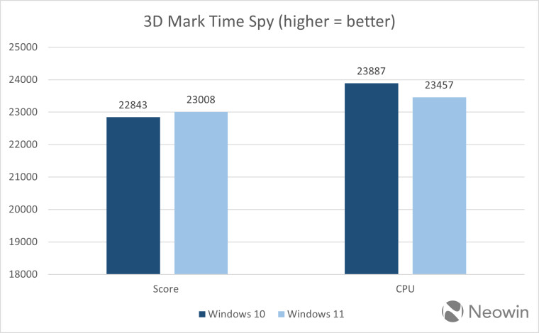 Si Windows 11 está tan optimizado en ese sentido entonces la diferencia entre este y Windows 10 debería ser muy grande con dicho procesador, ¿verdad? Esa es la teoría, pero la realidad es que al final ambos sistemas operativos consiguen prácticamente el mismo nivel de rendimiento en las pruebas que se han utilizado en esta comparativa. Por ejemplo, en Time Spy vemos que el Intel Core i9-14900K rinde mejor con Windows 11, pero las diferencias son muy pequeñas, apenas 165 puntos.