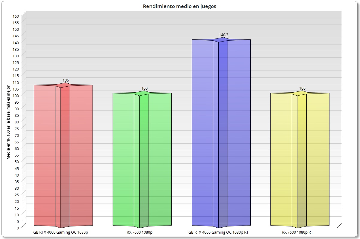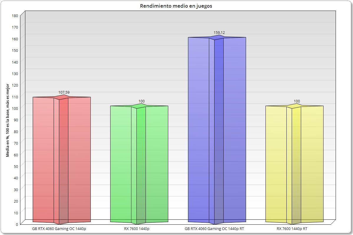 Por ese precio ofrece un valor excelente. Su rendimiento es ideal en 1080p y aguanta bien el tipo en 1440p, posicionando en general por encima de la Radeon RX 7600 en rasterización y ofreciendo un rendimiento muy superior en trazado de rayos. Además cuenta con todas las ventajas inherentes a la arquitectura Ada Lovelace: