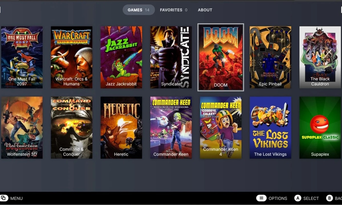 Ahora mismo hay disponibles un total de 14 juegos, incluyendo Warcraft: Orcs and Humans, DOOM, Syndicate, Heretic, Comand and Conquer y Jazz Jackrabbit. Para jugar a ellos solo tenemos que seleccionarlos y hace clic en el botón correspondiente, aunque no todos se encuentran disponibles en versión completa. Muchos son una versión shareware que nos da acceso limitado al juego, y nos ofrecen la posibilidad de comprarlos a través de diferentes plataformas, como Steam y Good Old Games.