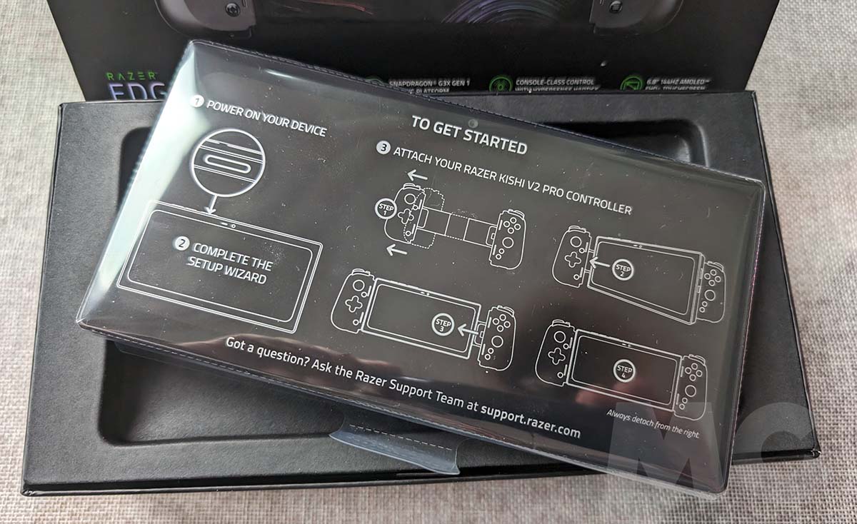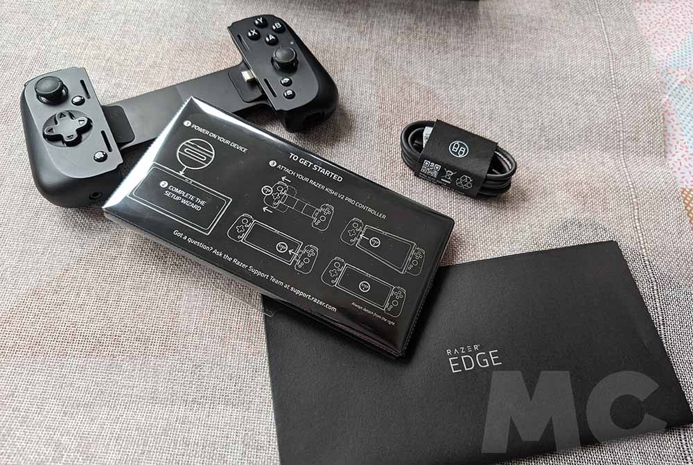 Tras sacar la Edge de la caja, veremos una bandeja que podemos retirar y que nos da acceso al nivel inferior, donde encontraremos el Kishi V2 Pro, documentación sobre el dispositivo y un cable USB-C a USB-C que podemos emplear para cargar la consola, ya sea directamente a través de su puerto, o bien empleando el del mando, si ya lo hemos conectado