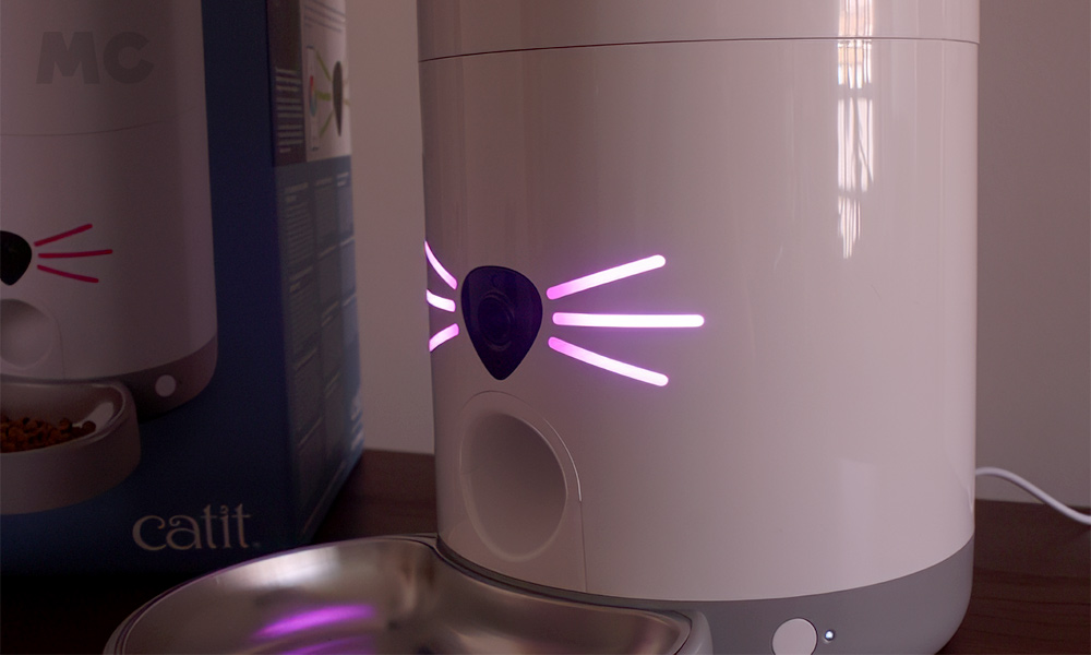 Seguimos con las novedades del Comedero Inteligente Vision Catit PIXI. Para acompañar a la visión nocturna y añadir aún más fantasía a este comedero, los bigotes han pasado a ser luces LED personalizables, que además de iluminar le dan un toque diferente. Por supuesto se pueden desactivar si así lo prefieres. Eso sí, te recomendamos no ponerlos en rojo, ya que otra de sus funciones es la de avisarte si queda poca comida y, efectivamente, la alerta será en color rojo. No hay mucho problema ya que la app también te notificará cuando quede poca comida, pero por si acaso.