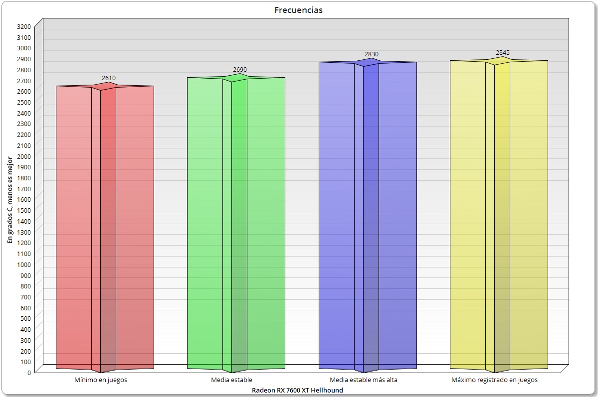 La PowerColor AMD Radeon RX 7600 XT Hellhound tiene overclock de casa, y esto le permite alcanzar velocidades máximas de 2.845 MHz, aunque este valor tan alto no se mantiene. La media estable más alta que pude registrar durante un tiempo limitado fue de 2.830 MHz, y la media más estable se mantuvo siempre cerca de los 2.700 MHz. Los valores bastante estables, y esto permite un rendimiento consistente.