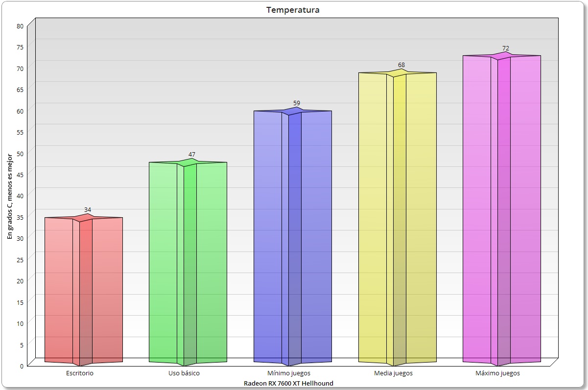 La PowerColor AMD Radeon RX 7600 XT Hellhound no destaca por su eficiencia y tampoco por sus temperaturas de trabajo, eso está claro, pero se mantiene en niveles de temperatura totalmente seguros, tiene un consumo que se mantiene en los límites del TBP base de 190 vatios y es capaz de trabajar en un rango de frecuencias consistente y estable.