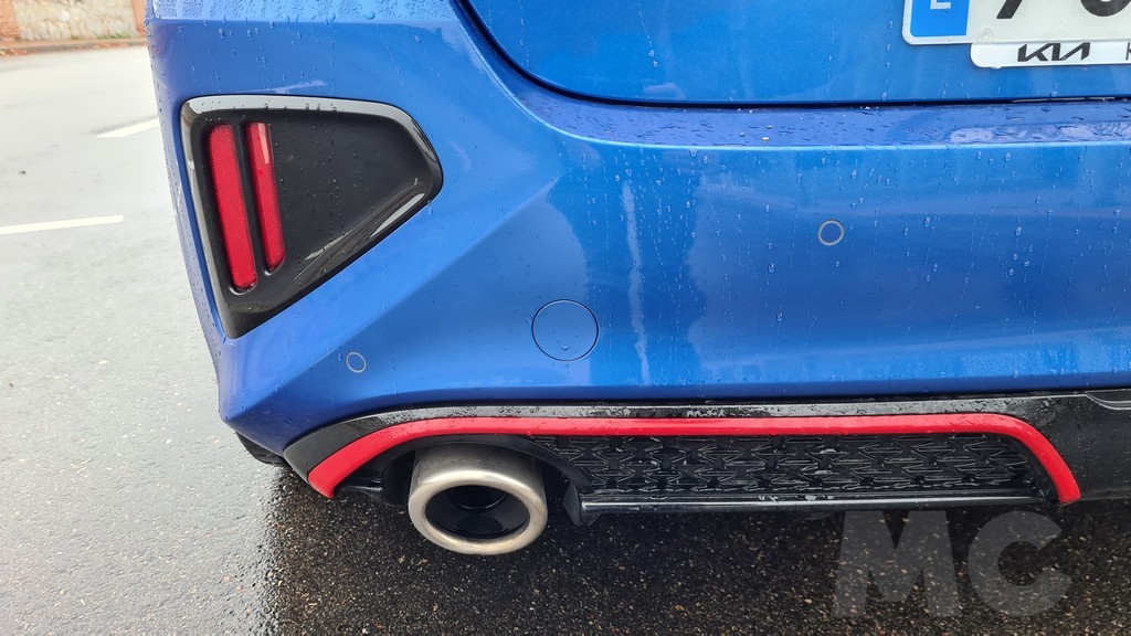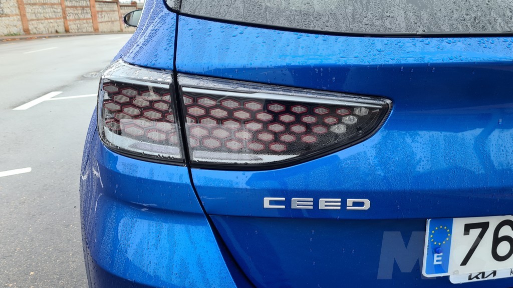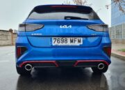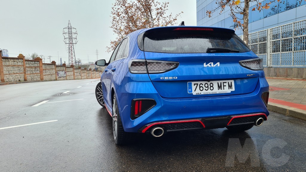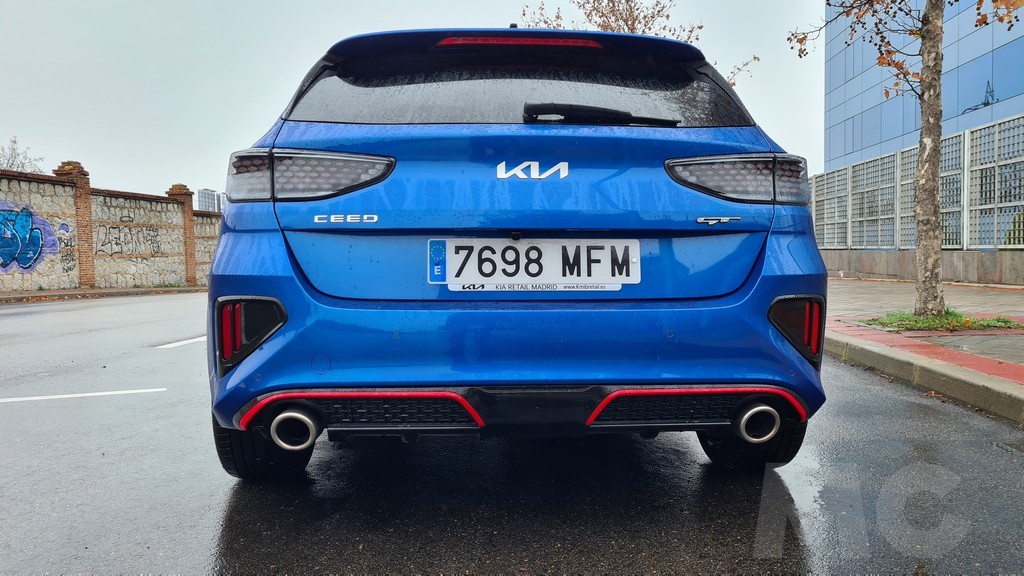 En la parte trasera del Ceed también encontramos cambios significativos en el diseño con respecto a la versión anterior de este modelo. Como en la parte frontal el centro del portón luce el rediseñado logo de la marca mientras que los grupos ópticos tienen un aspecto distinto así como el difusor y el spoiler que domina la parte superior del portón. En esta variante GT se han aplicado retoques estéticos con molduras en color rojo en la parte del difusor bajo el paragolpes que tiene un diseño distinto al Ceed de serie. También cambian las salidas de escape, en el GT son dos salidas de forma redonda en los laterales.