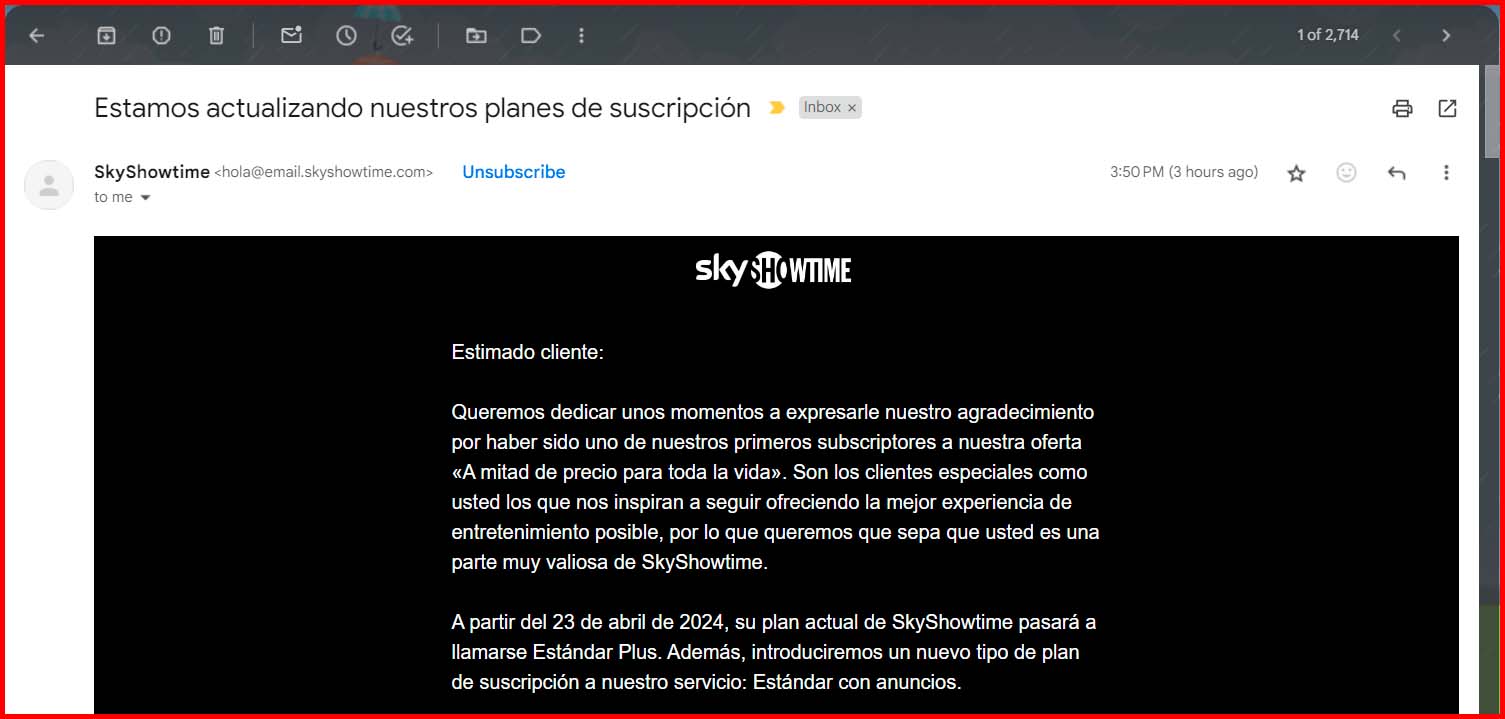 Ya en aquel momento me atreví a aventurar que ocurriría lo mismo que con HBO-MAX, y ahora tenemos la confirmación oficial, ya que SkyShowtime ha enviado un email a sus suscriptores, informándoles de que su plan pasará a costar 3,99 euros mensuales, frente a los 2,99 euros que ha mantenido hasta ahora. Así, su precio se mantiene en el 50% con respecto a la cuota normal del servicio que, además, también estrenará un nuevo plan más económico pero con publicidad.