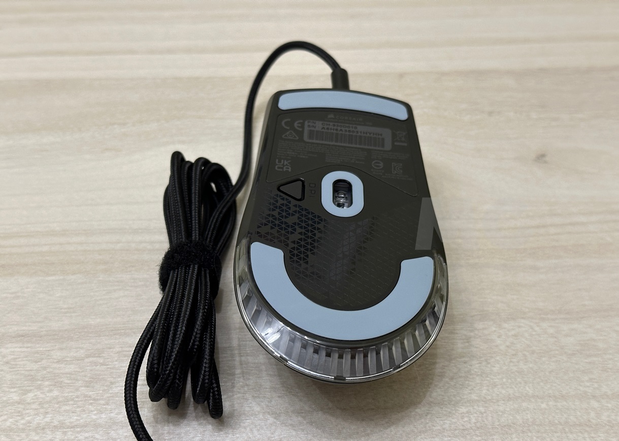 La rueda de scroll vertical está situada en posición central, y trabaja también como quinto botón gracias al clic que integra. En la parte inferior tenemos el logo de Corsair y dos líneas que marcan la silueta del ratón, todas equipadas con iluminación LED RGB. Dicha iluminación también está presente en la base del ratón, justo en la parte superior de la primera almohadilla de teflón, y en el centro tenemos el sensor óptico y un botón de configuración de DPI.