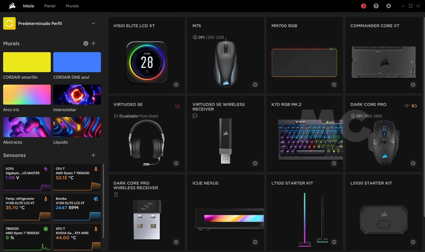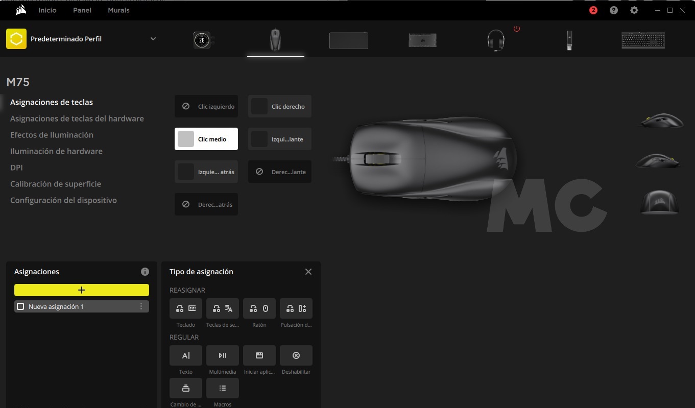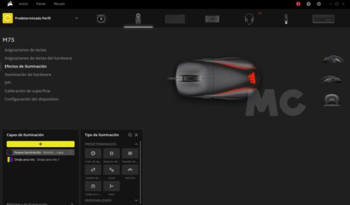 Podemos descargar iCUE desde la web oficial de Corsair. Es totalmente gratuita y muy ligera, tanto por peso como por consumo de recursos. A través de esta aplicación podremos personalizar nuestro Corsair M75 y accederemos a funciones avanzadas muy interesantes. Haciendo clic en la galería adjunta podréis dar un paseo virtual por iCUE, y a continuación os dejo un resumen con las secciones más importantes que ofrece: