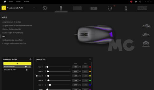 La interfaz de iCUE es muy sencilla e intuitiva, y esto nos permite empezar a disfrutar del Corsair M75 al instante, sin periodos de aprendizaje ni de adaptación. Como hemos visto, también está llena de posibilidades, y podremos personalizar a fondo este ratón para adaptarlo por completo a nuestras necesidades en cualquier situación. Podemos elegir entre un amplio rango de niveles de DPI, y también tendremos la posibilidad de configurar un botón en modo «sniper», que reduce el nivel de DPI para conseguir una mayor precisión.