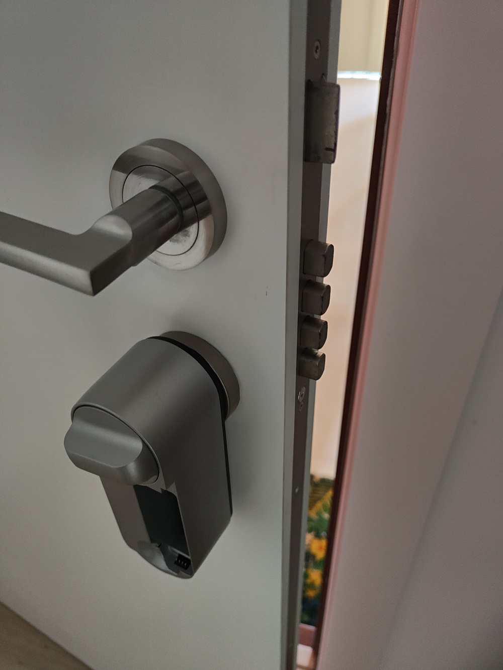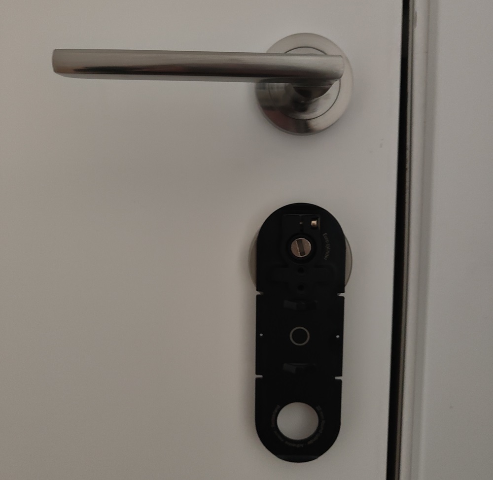 La caja del bombín viene con todas las instrucciones y pasos a dar y es muy importante seguirlas porque cualquier error repercute en la instalación final. Aconsejamos medir bien el agujero del bombín, teniendo en cuenta que este ha de sobresalir un poco (por el interior) para poder colgar la cerradura. Una vez hecha las mediciones y puestos los adaptadores (si lo necesitas) quedaría la segunda parte. Antes de avanzar, nos aseguramos de que la llave abre correctamente desde fuera, ya que esto es una garantía o plan B por si se nos olvida el móvil en casa, no tenemos wifi o la cerradura falla por cualquier circunstancia.